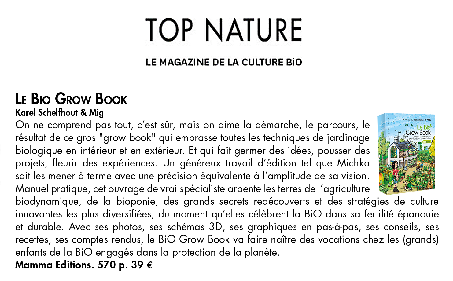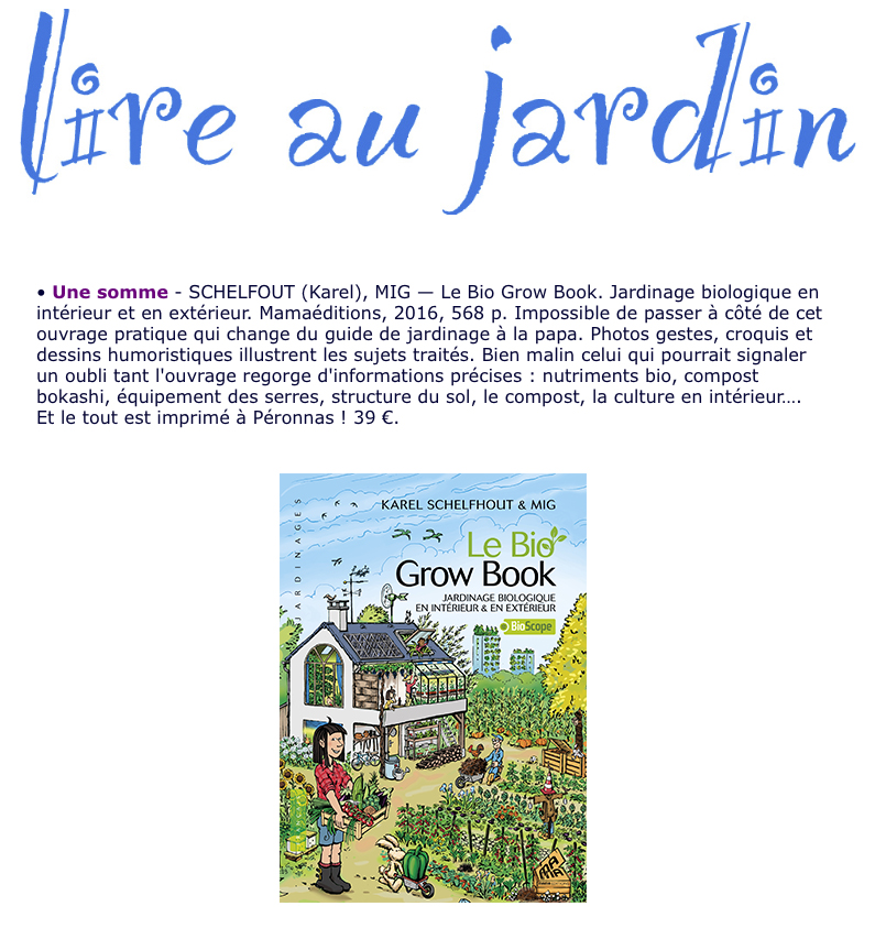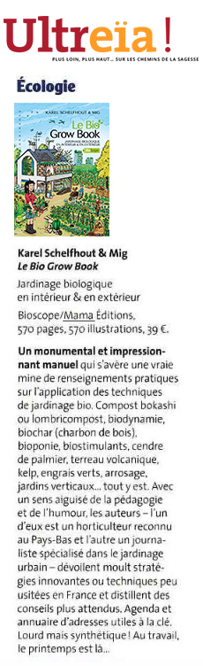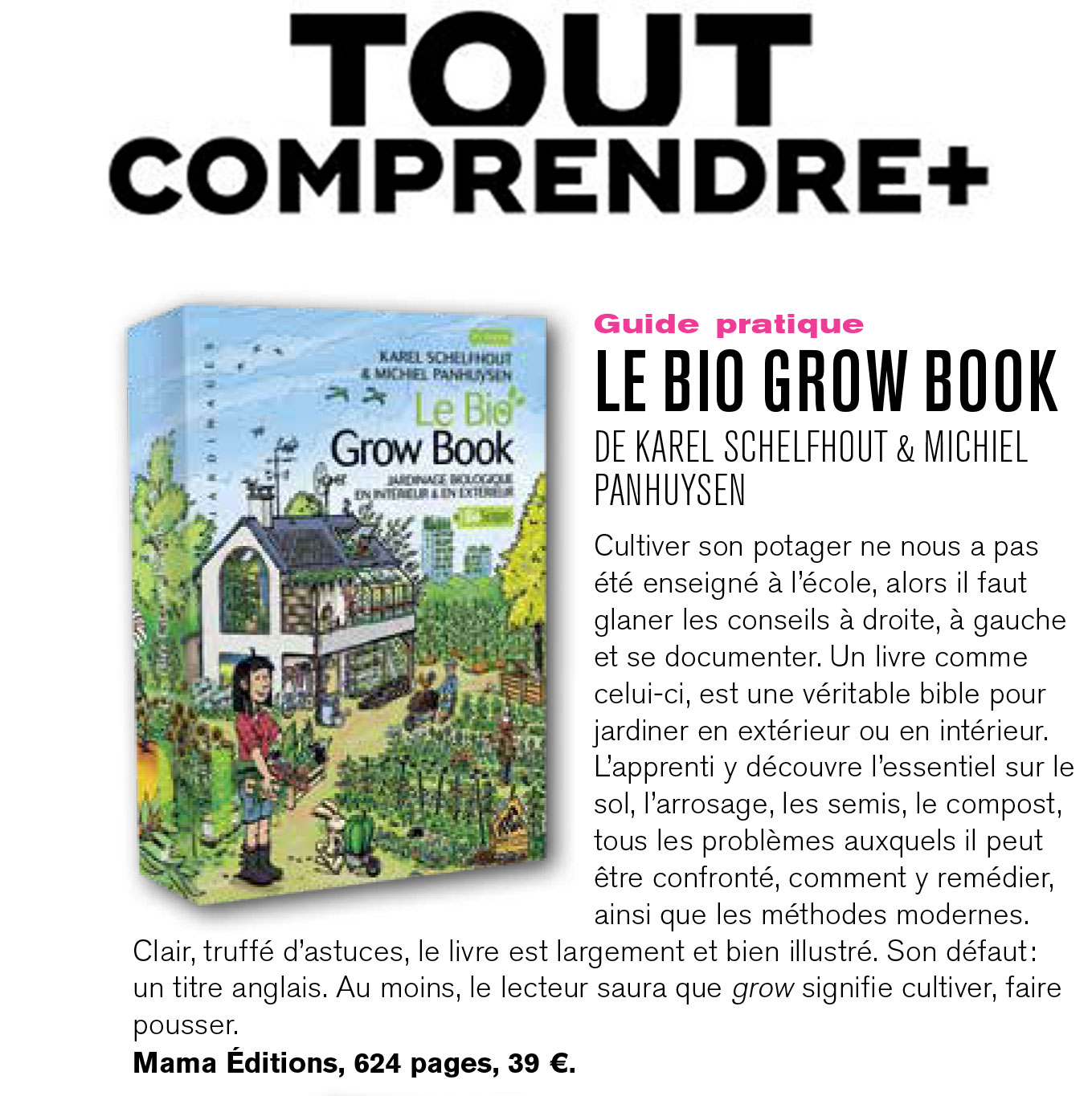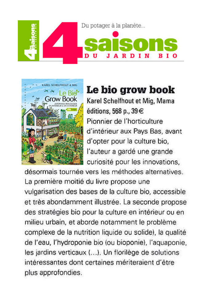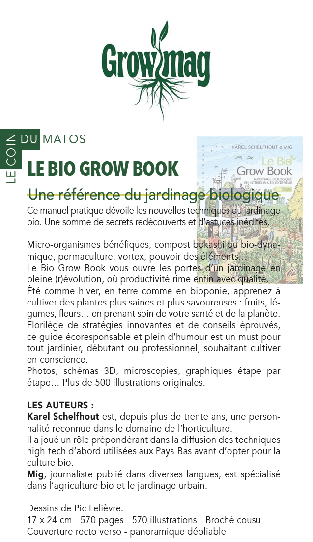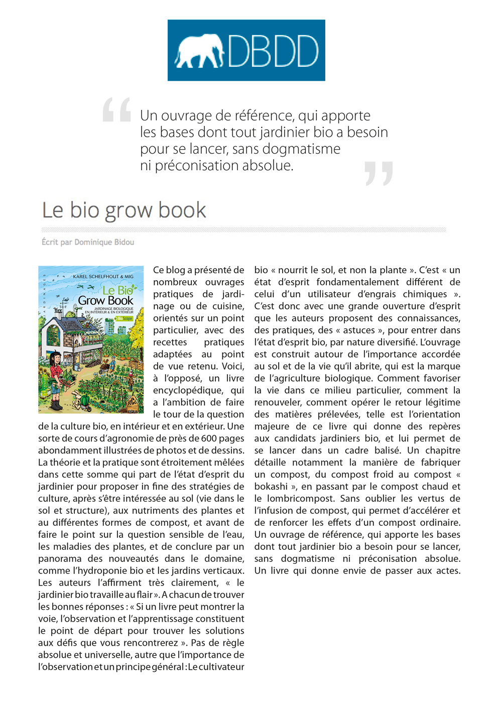 Le [Bio Grow Book] est une synthèse bienvenue de toutes les pratiques du jardinage bio, nouvelles ou réinventées avec succès. (...) Les textes sont clairs et étoffés et les photos magnifiques.