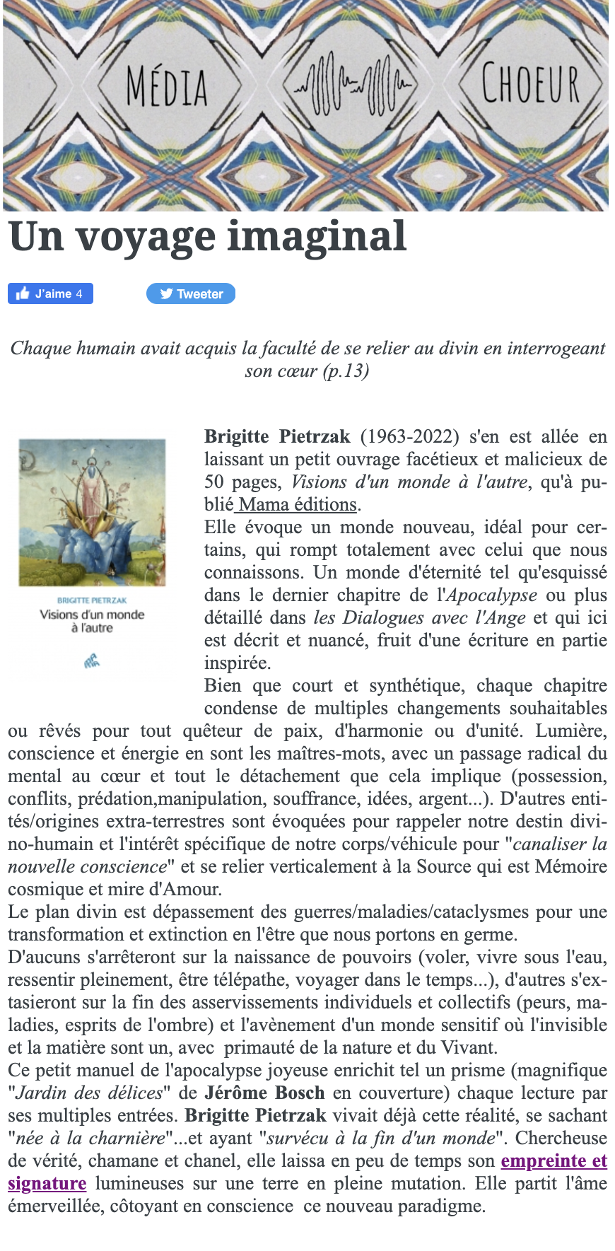 Brigitte Pietrzak a créé en 2019 le groupe Facebook « Qu’est-ce que le chamanisme ? », dans lequel elle partage sa vision du chamanisme et son expérience.