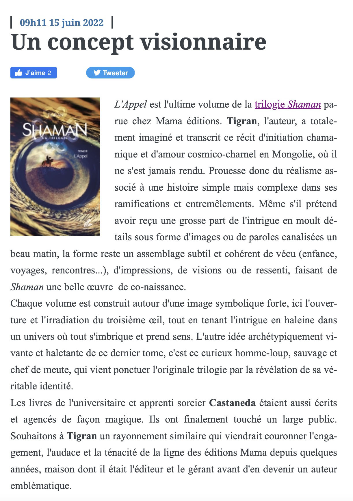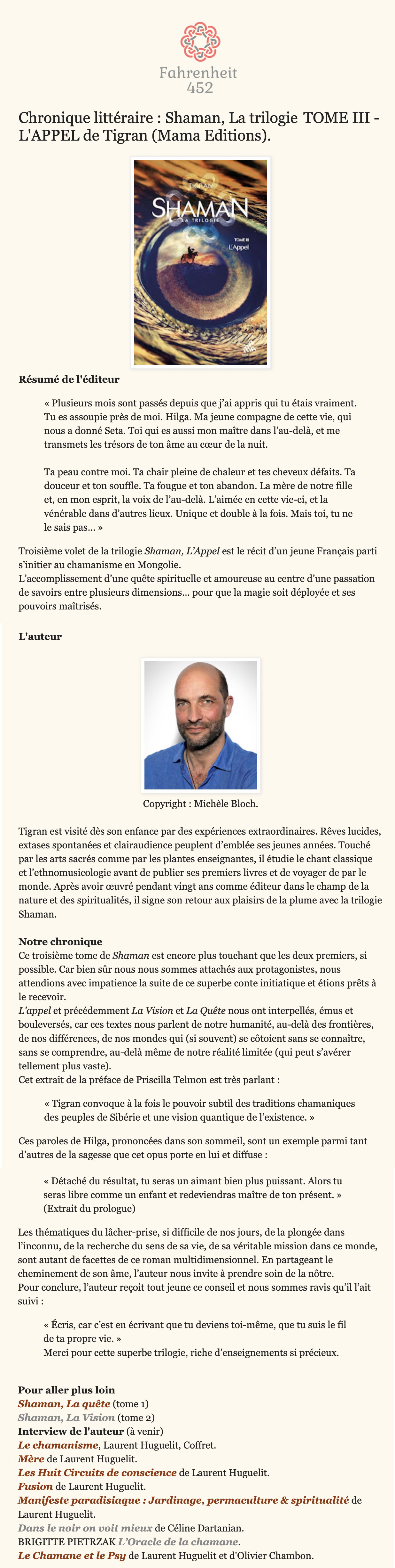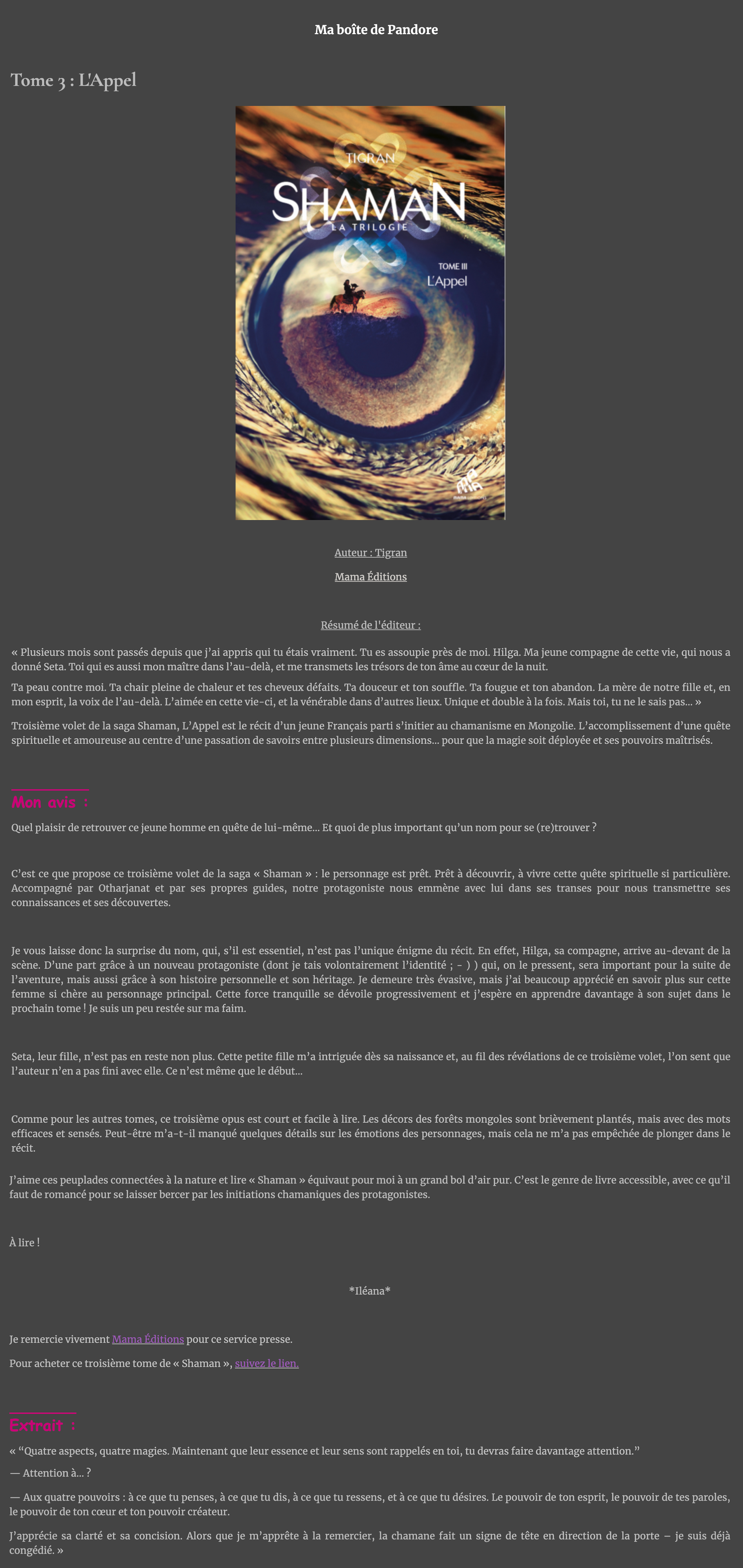 Ce troisième tome de Shaman est encore plus touchant que les deux premiers, si possible. Ces trois tomes nous ont interpellés, émus et bouleversés. Merci pour cette superbe trilogie, riche d’enseignements si précieux.