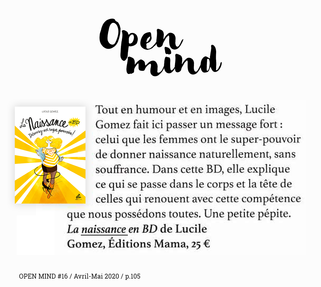 Cette bande dessinée évoque la naissance naturelle, explique la physiologie et ce qu’il se passe lorsque les femmes accouchent sans peur et sans gestes parasites.