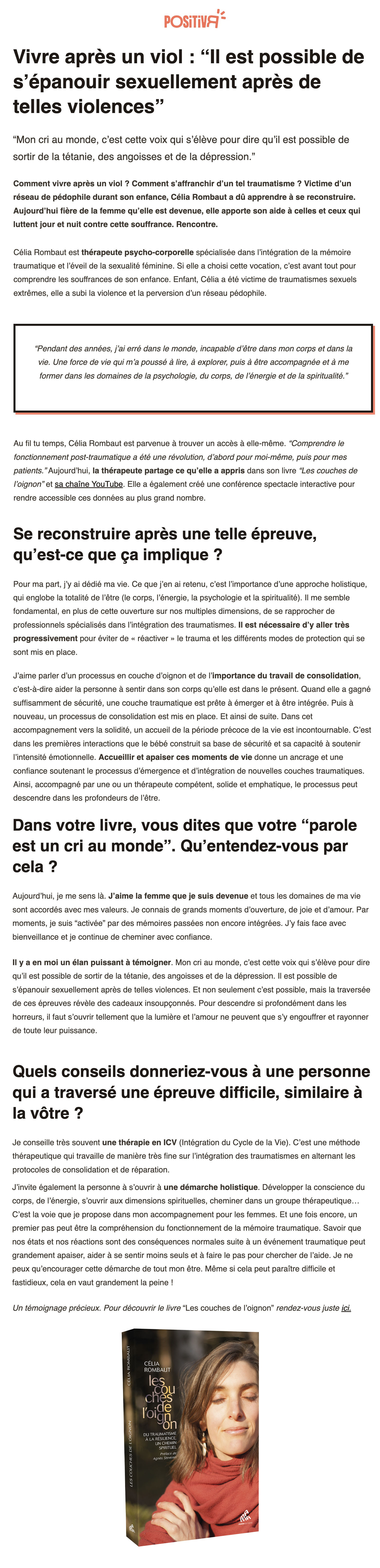 Comment vivre après un viol ? Comment s’affranchir d’un tel traumatisme ? Célia Rombaut a dû apprendre à se reconstruire et apporte son aide à celles et ceux qui luttent jour et nuit contre cette souffrance.