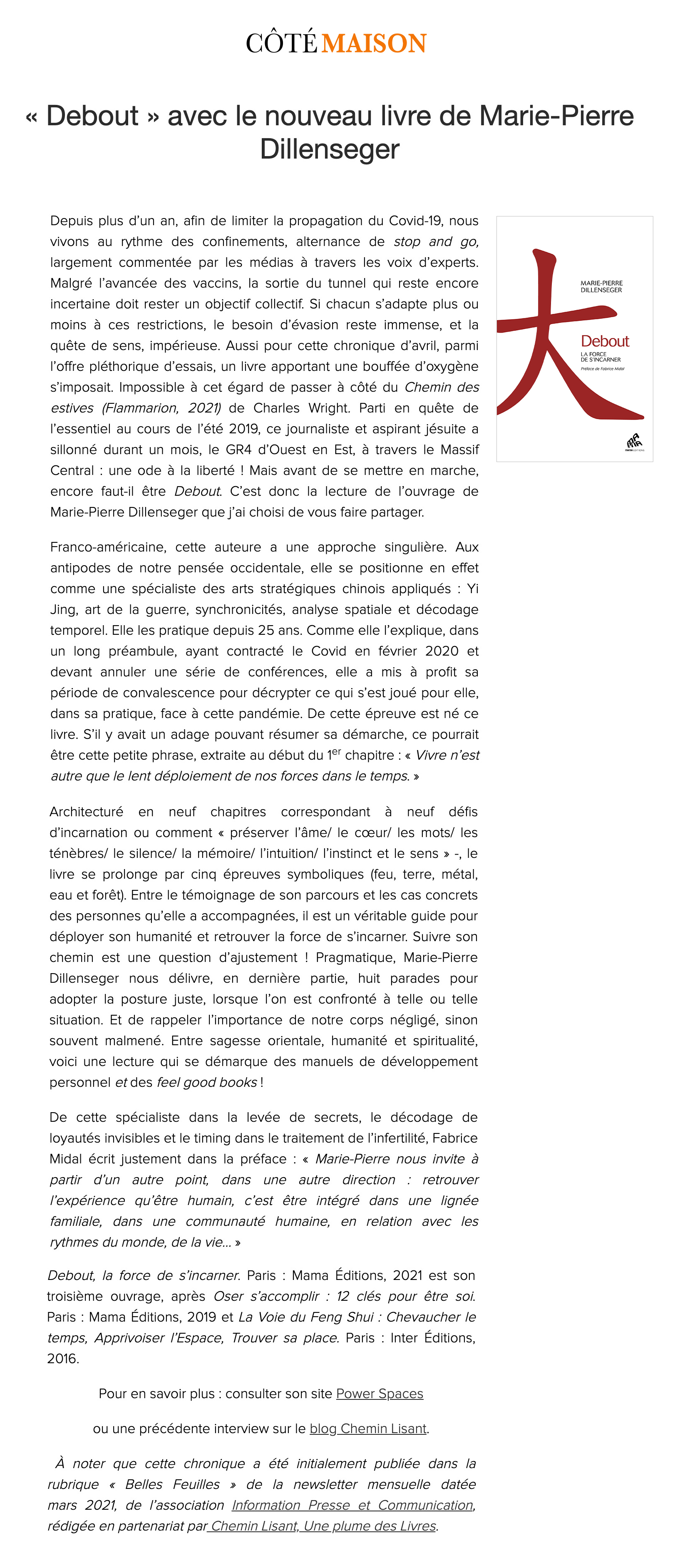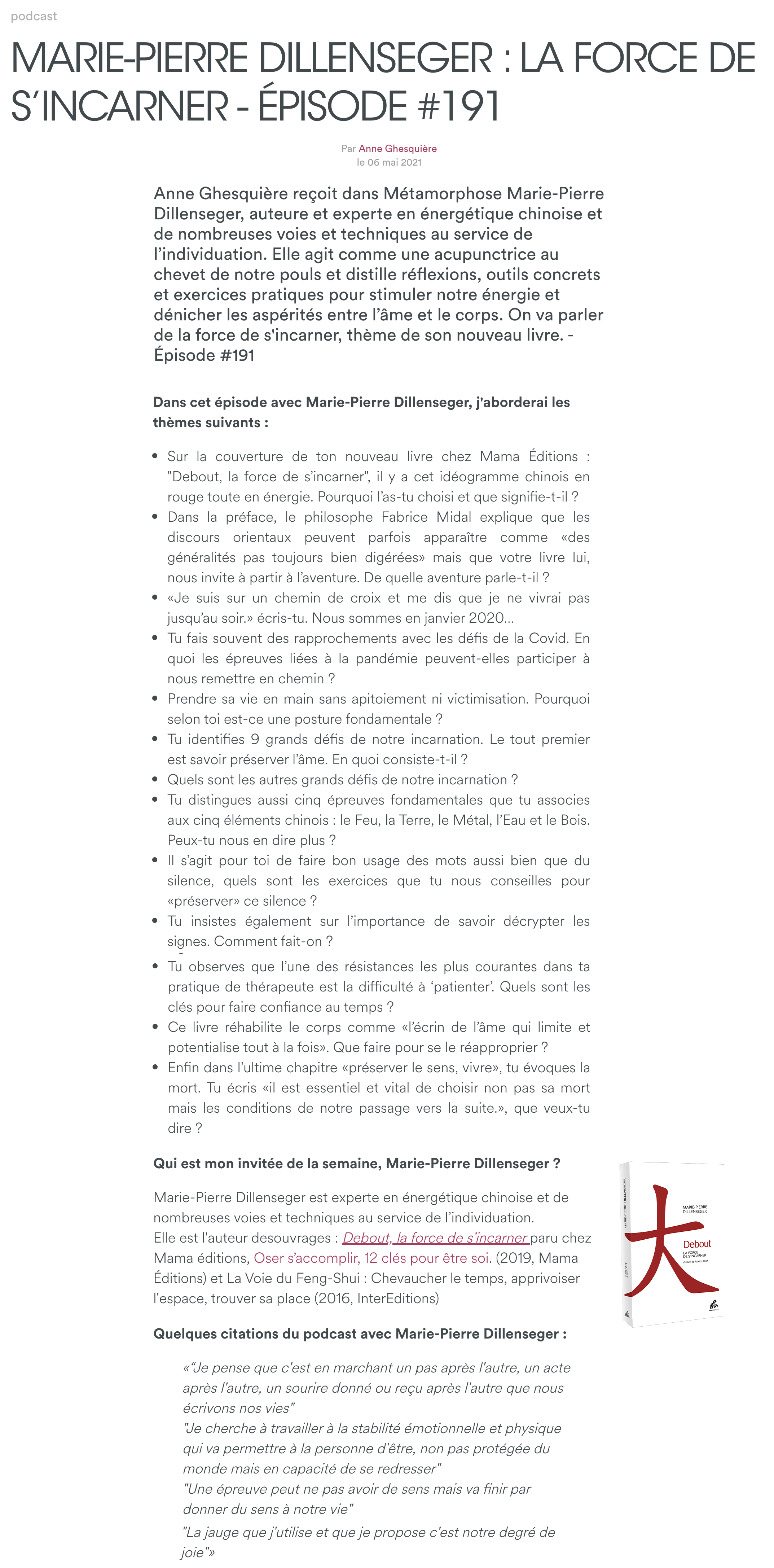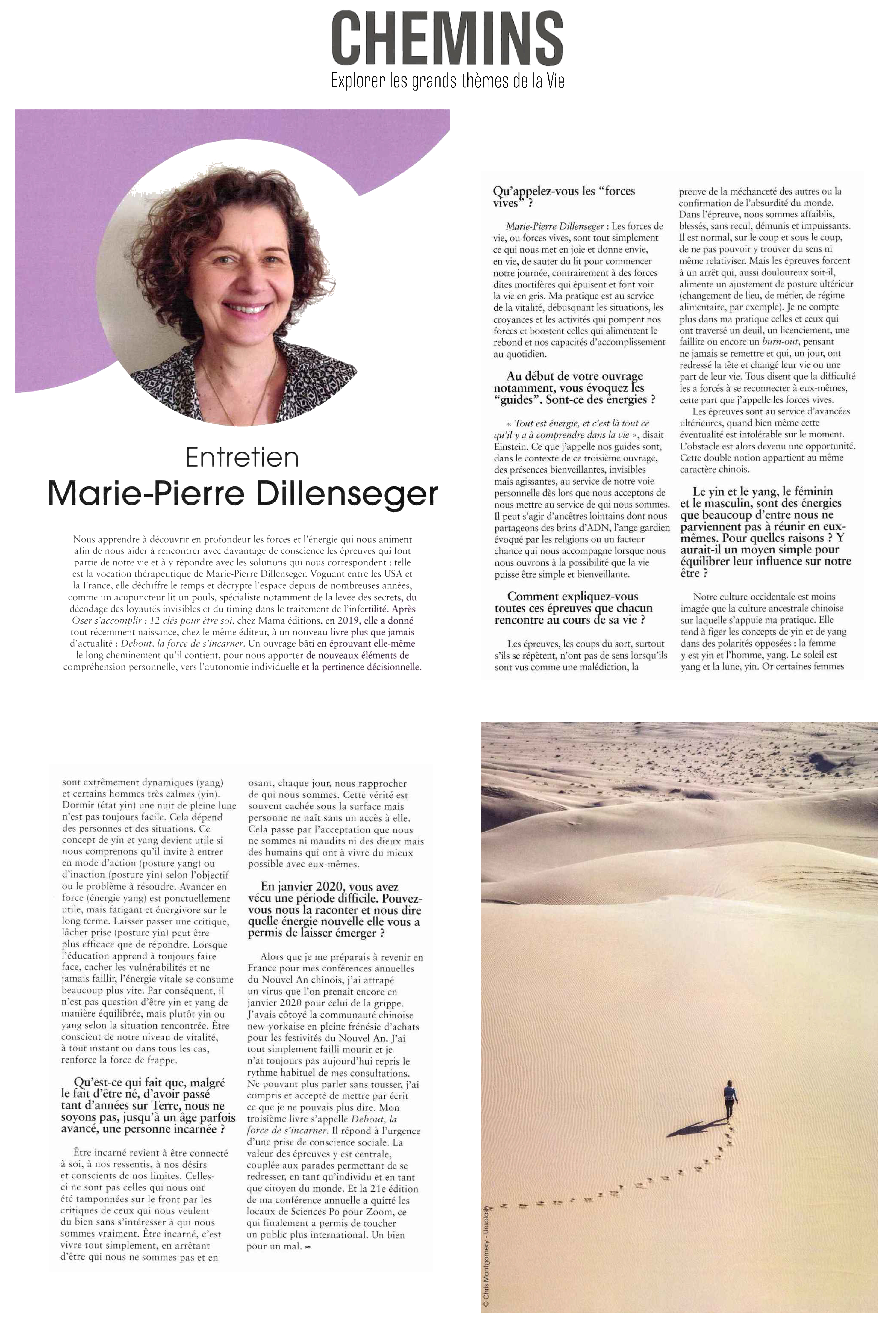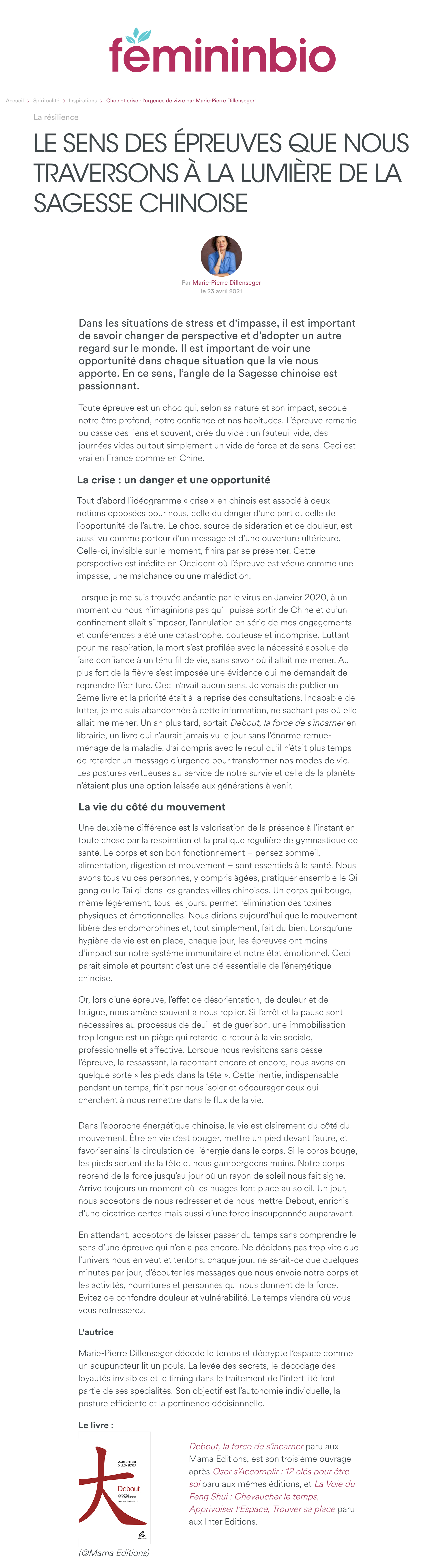 Marie-Pierre Dillenseger partage différents éléments qui permettent d’aborder ces moments en cherchant le bon équilibre entre l’énergie yang, dynamique et libre représentée par notre âme, et l’énergie yin, stable et posée, représentée par notre corps.