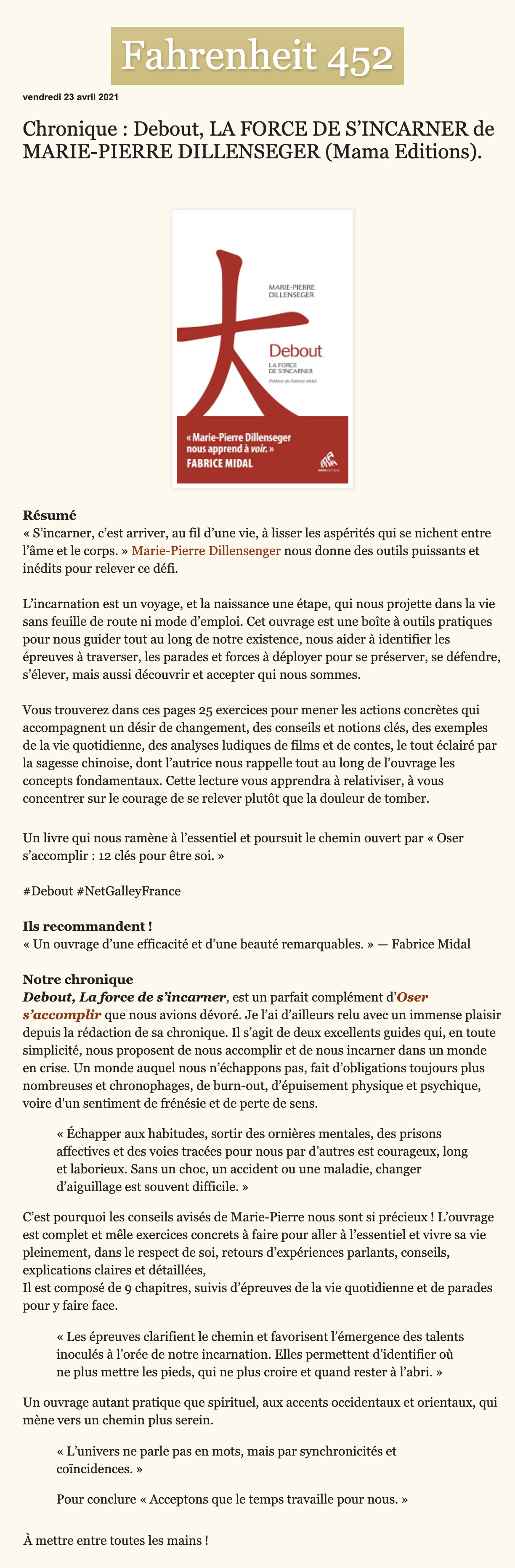 Entre le témoignage de son parcours et les cas concrets (…), ce livre est un véritable guide pour déployer son humanité et retrouver la force de s’incarner.