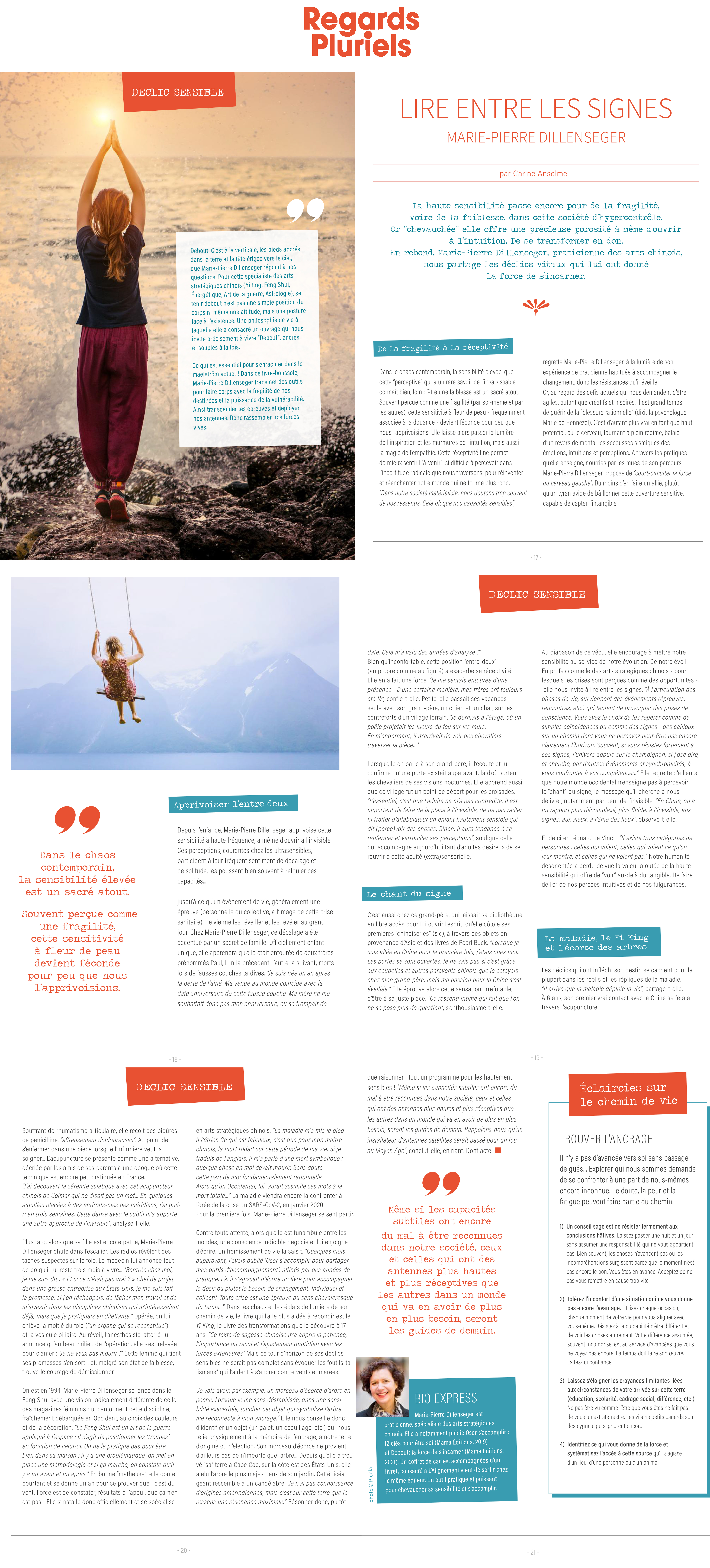Marie-Pierre Dillenseger agit comme une acupunctrice au chevet de notre pouls et distille réflexions, outils concrets et exercices pratiques pour stimuler notre énergie et dénicher les aspérités entre l’âme et le corps.
