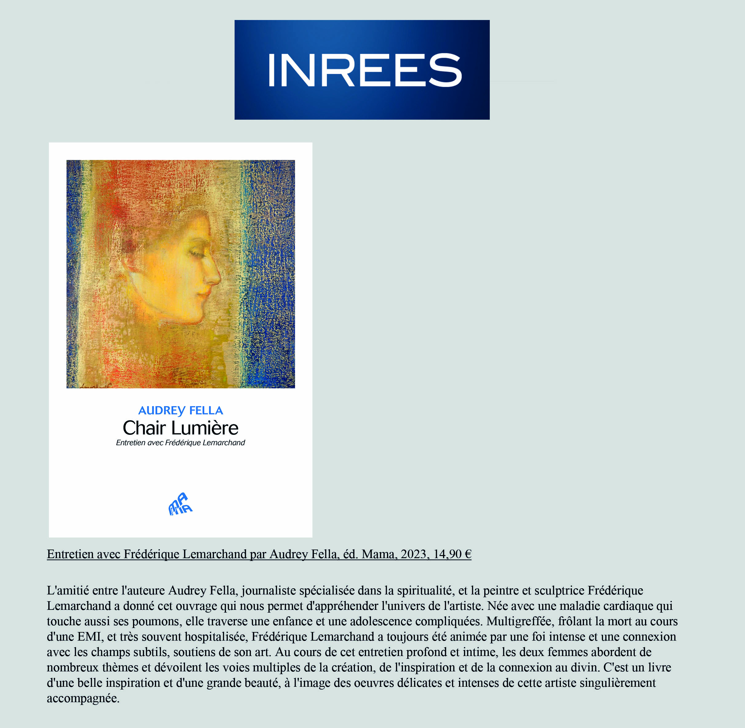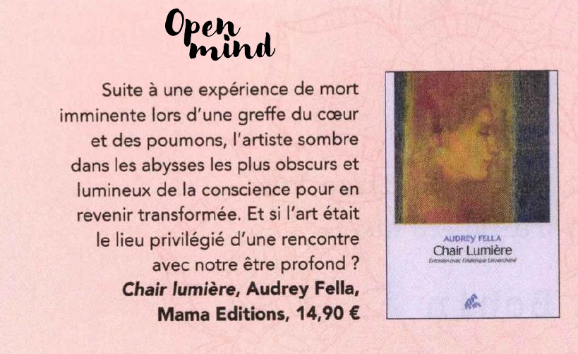 [Chair Lumière] signe la rencontre entre deux femmes devenues amies. Dans son livre sous forme d’entretien, l’essayiste Audrey Fella raconte l’artiste peintre et poétesse Frédérique Lemarchand, à l’incroyable destinée.