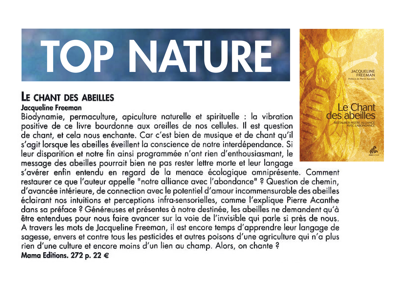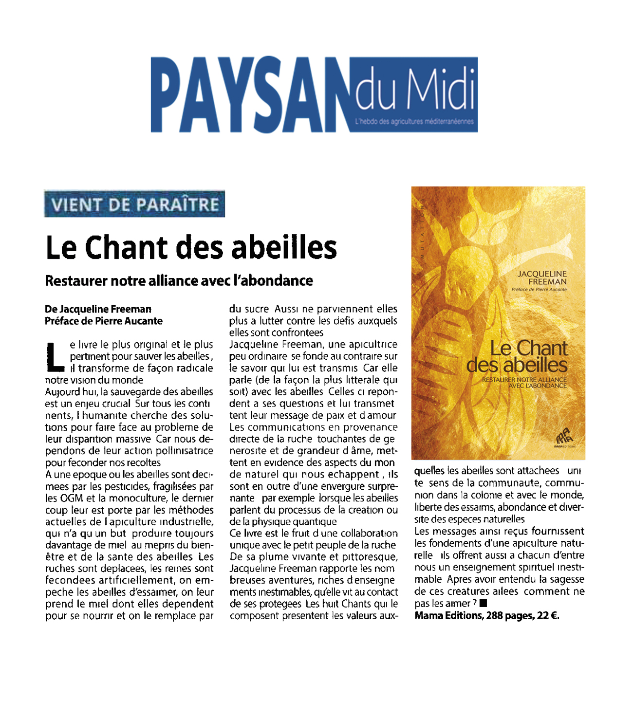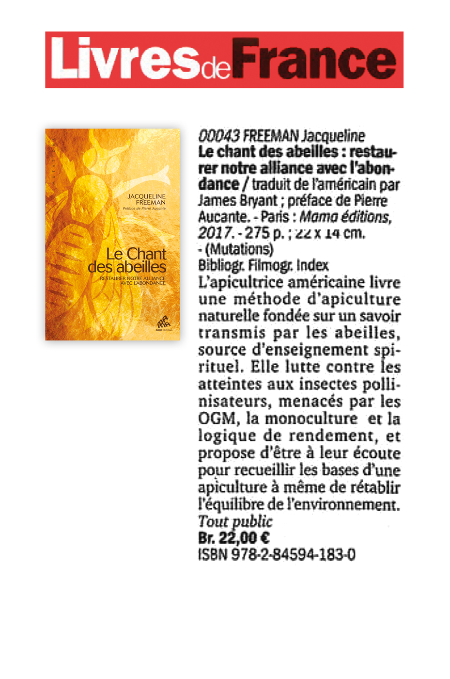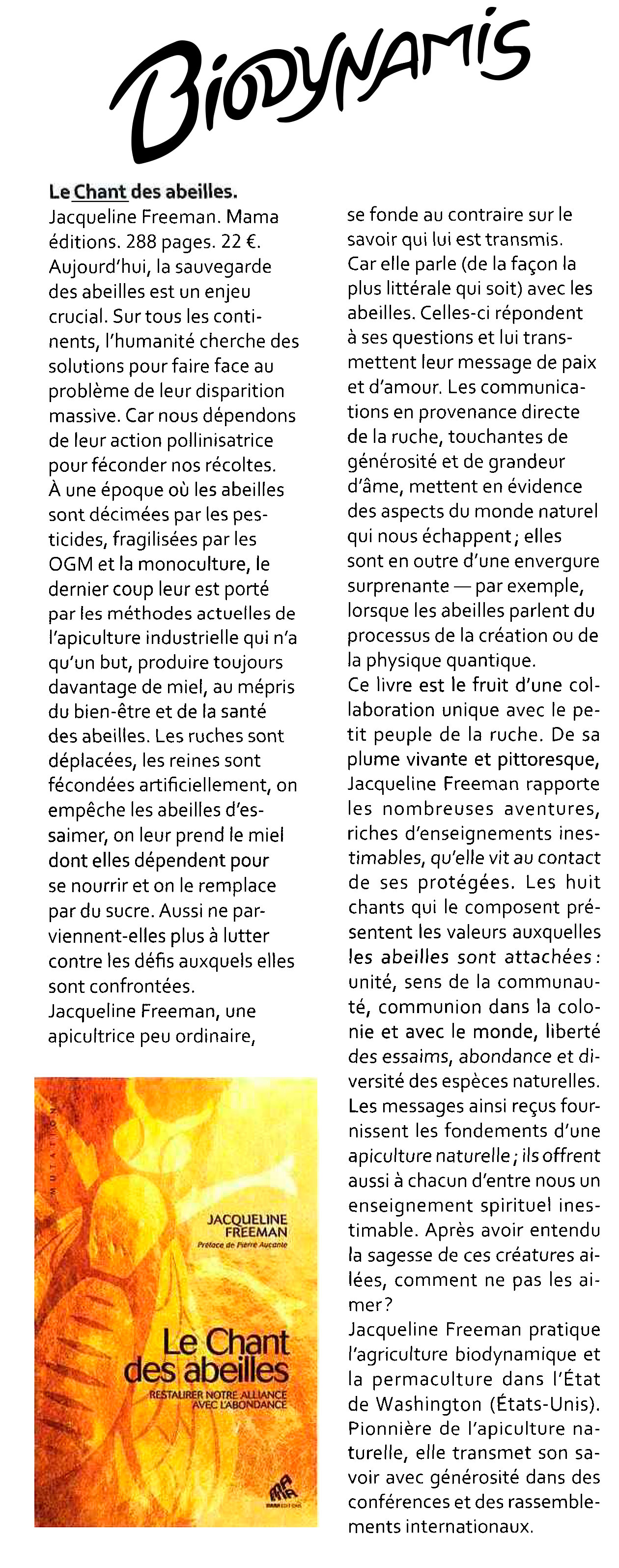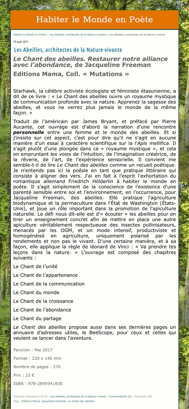 Dans un monde où les abeilles sont menacées — et l’agriculture humaine avec elles —, il est crucial de retranscrire l’univers des ruches dans une langue que nous pouvons comprendre. Le Chant des abeilles répond merveilleusement à ce besoin.