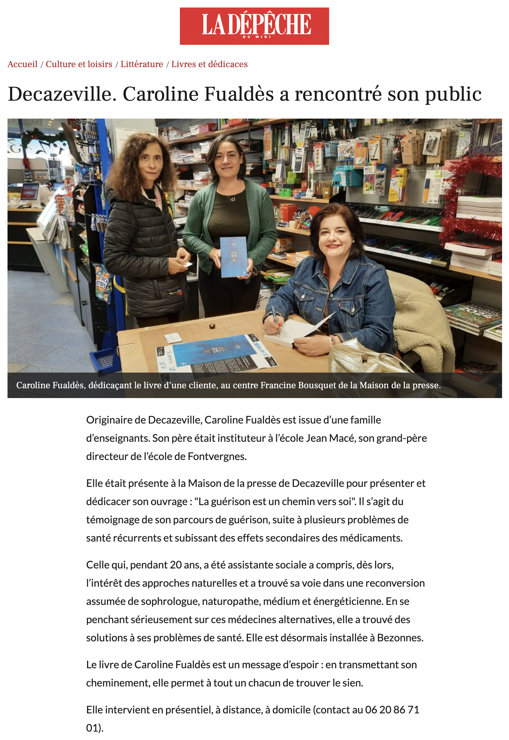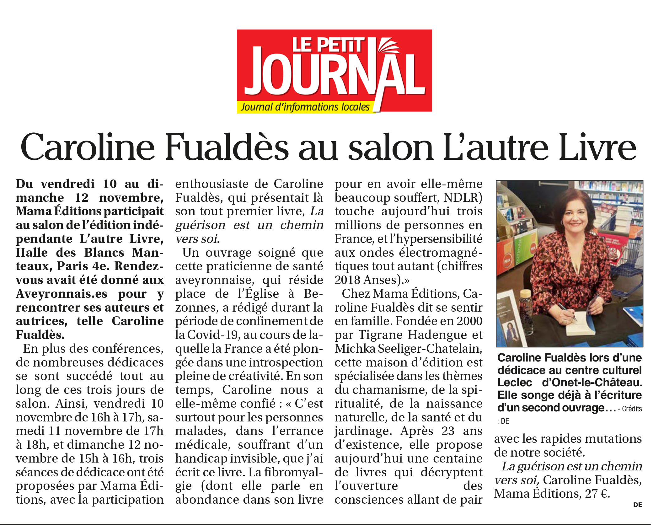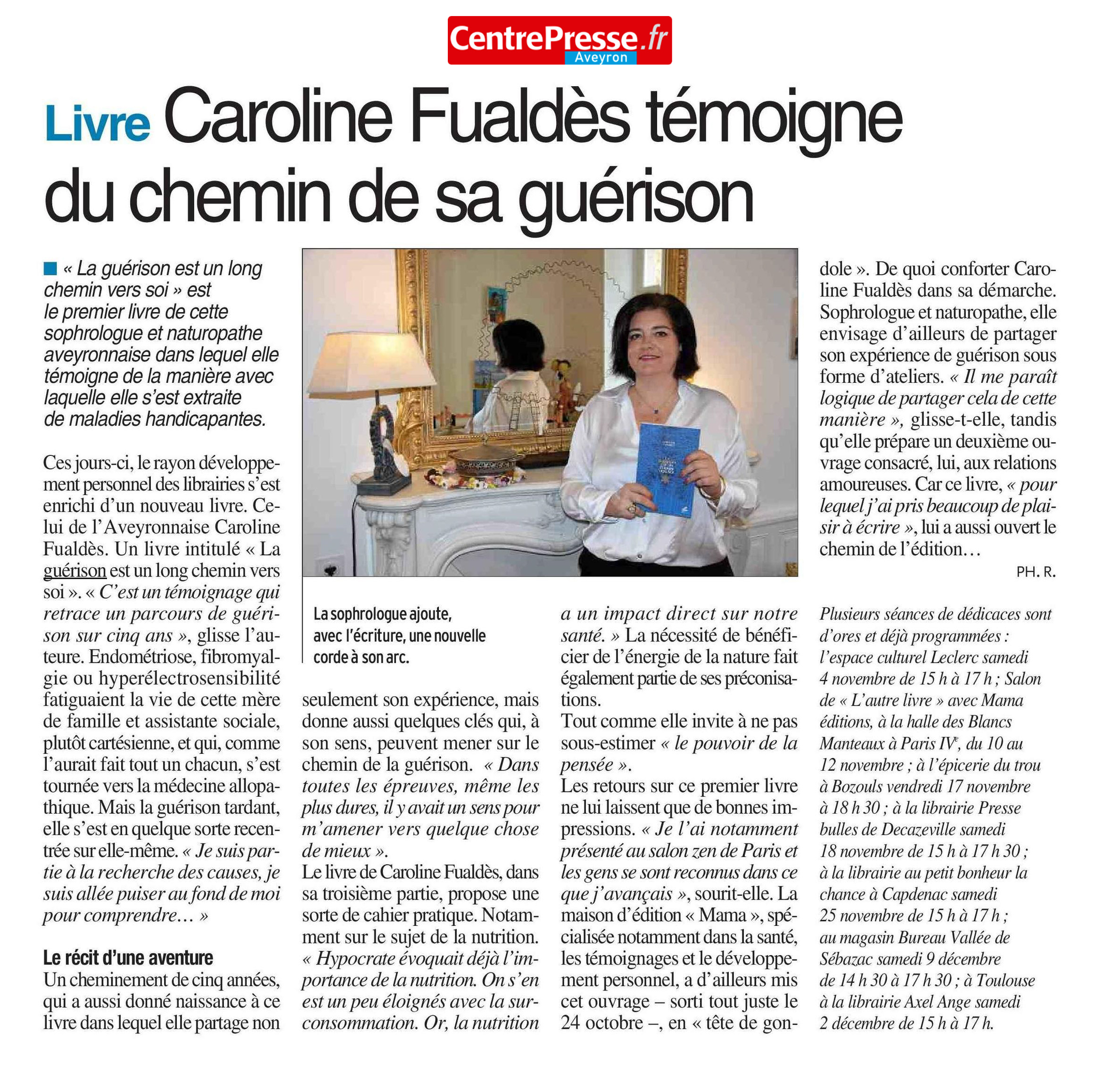 Dans son dessein de transmettre, Caroline Fualdès publie son premier livre [La guérison est un chemin vers soi] chez Mama Editions. Elle retrace son parcours avec ses chaos et ses maux, ses témoignages pour apporter sa méthode pluridisciplinaire.