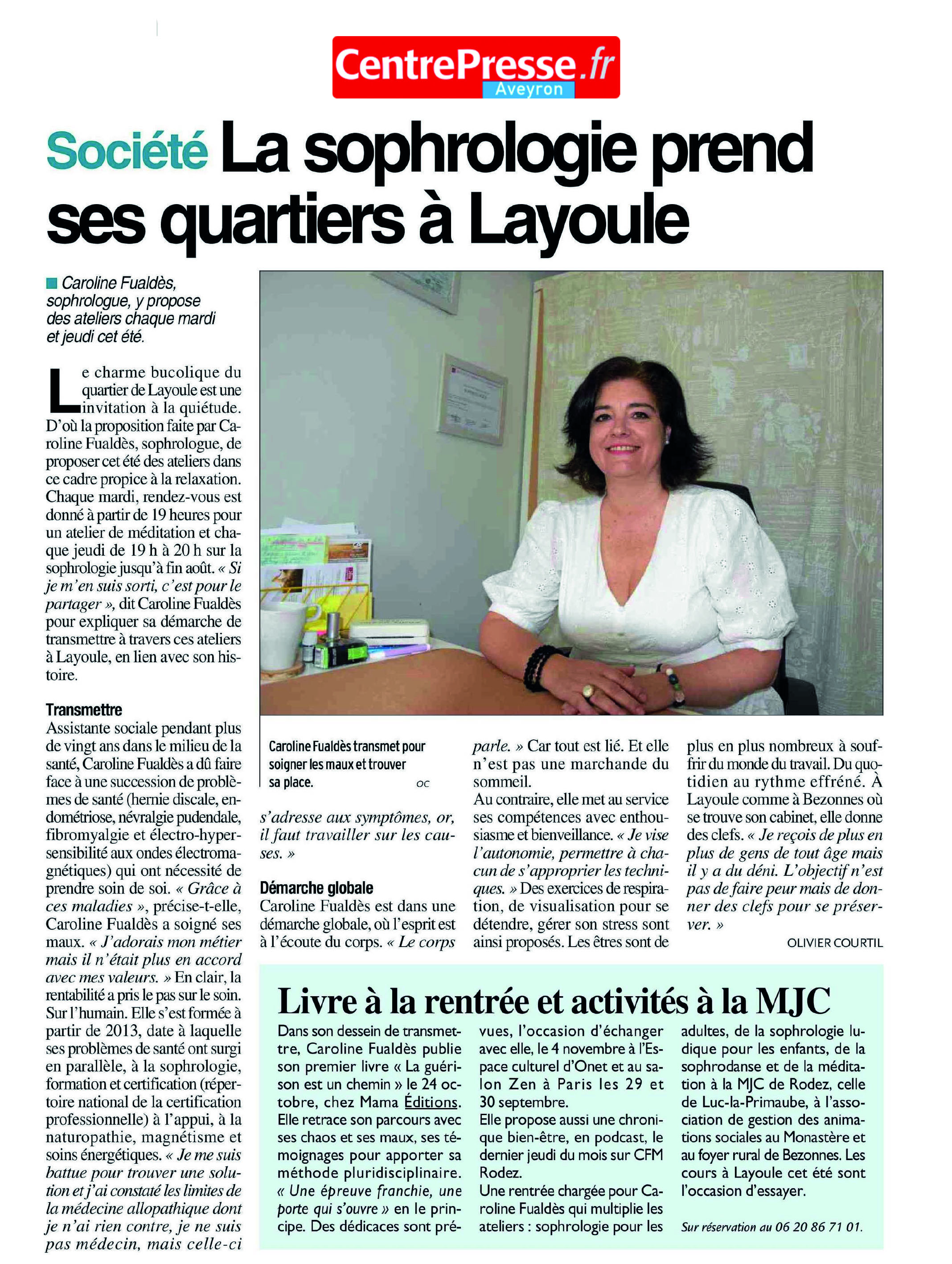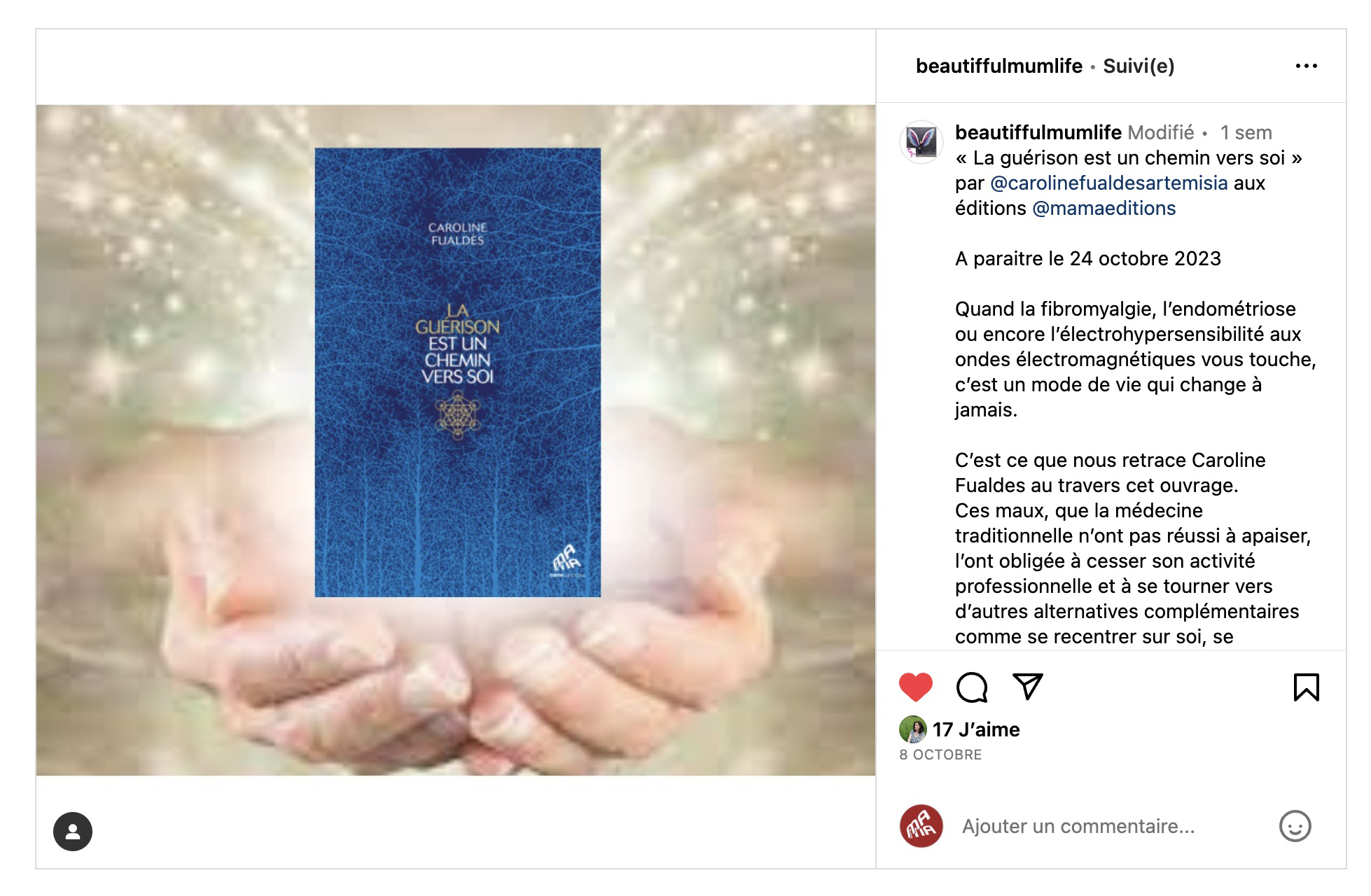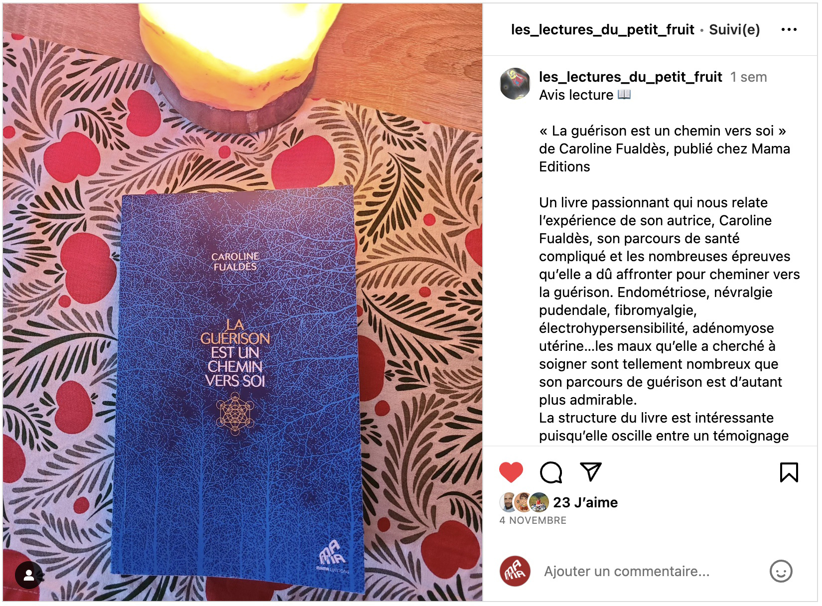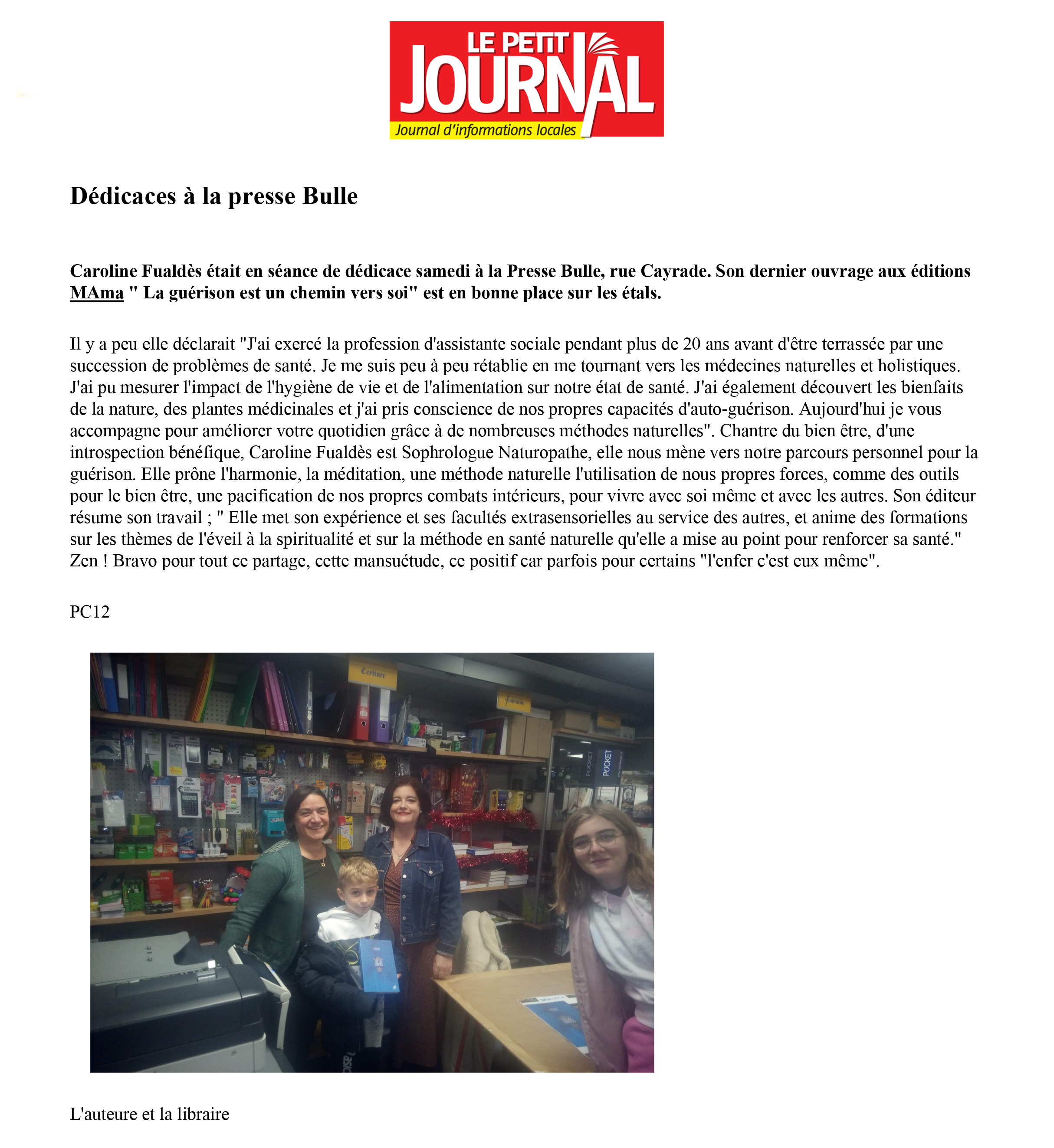 Dans son dessein de transmettre, Caroline Fualdès publie son premier livre [La guérison est un chemin vers soi] chez Mama Editions. Elle retrace son parcours avec ses chaos et ses maux, ses témoignages pour apporter sa méthode pluridisciplinaire.