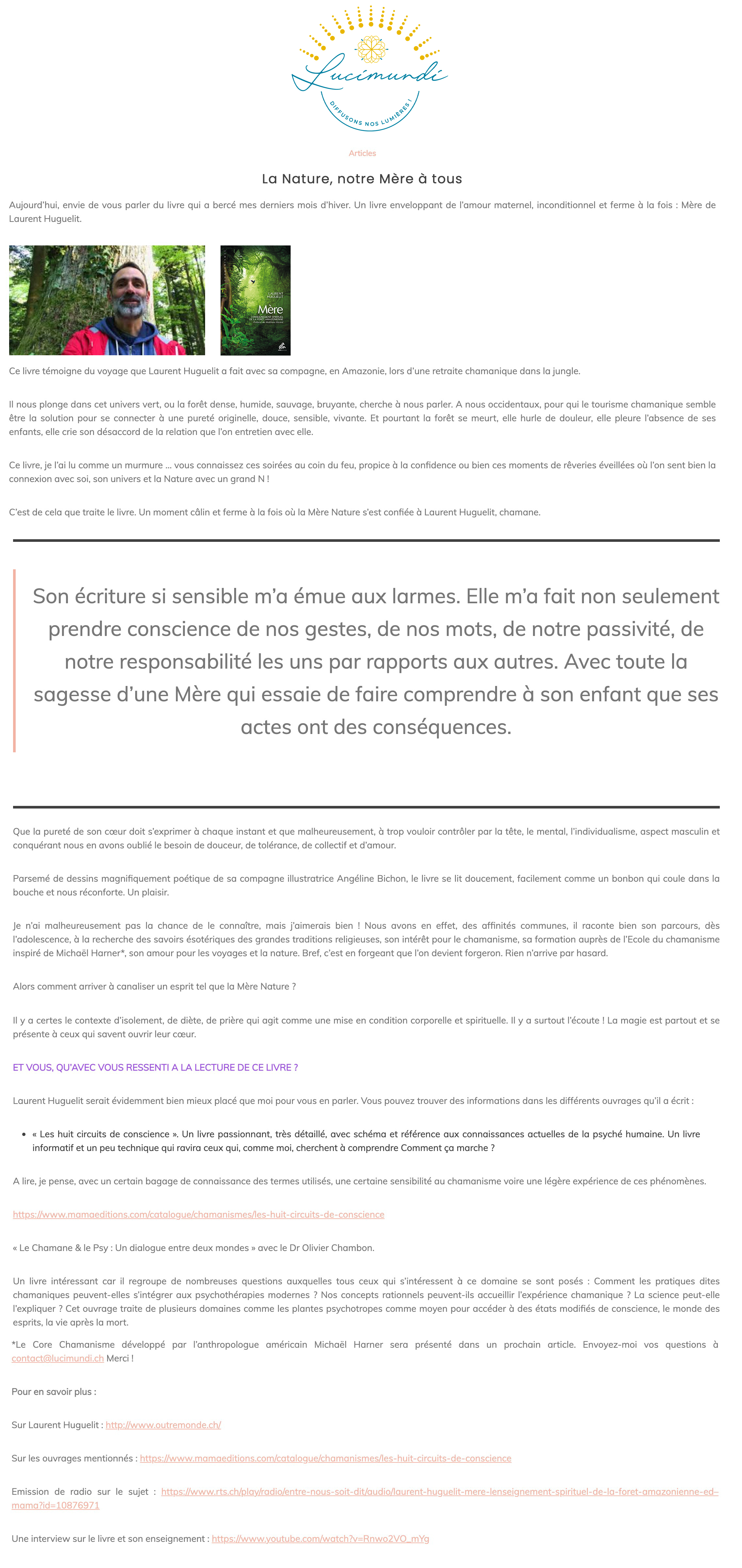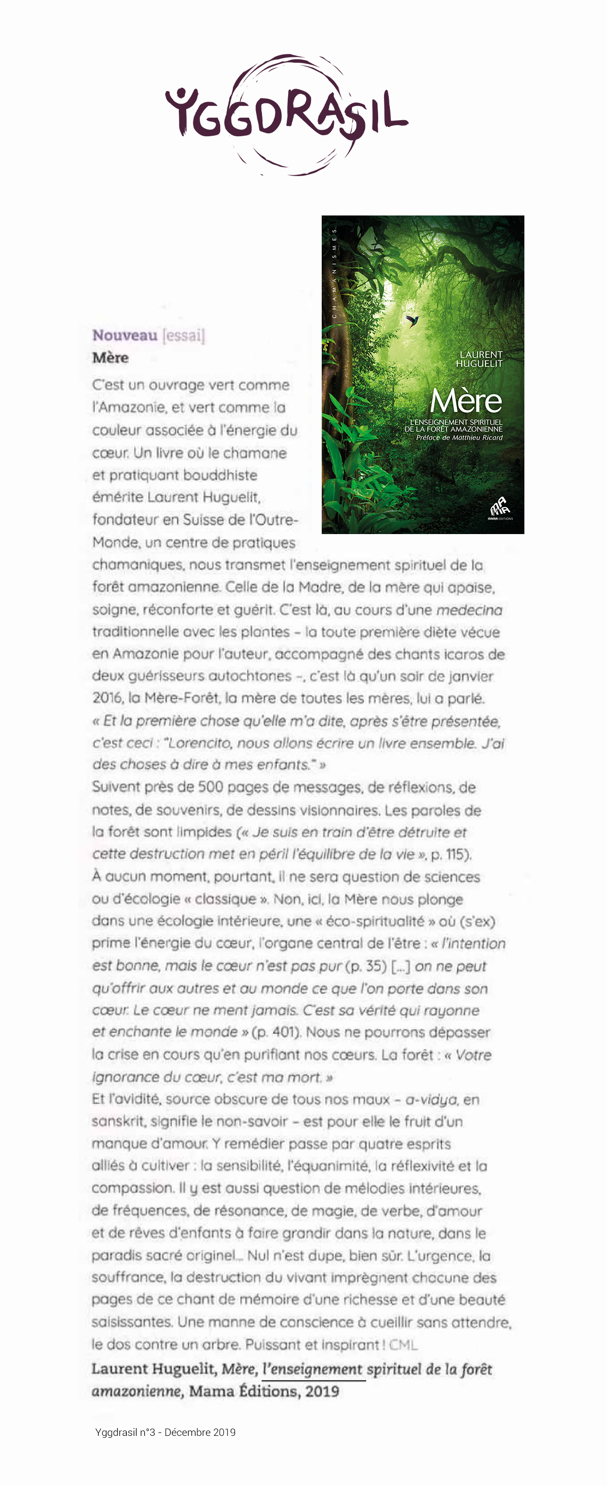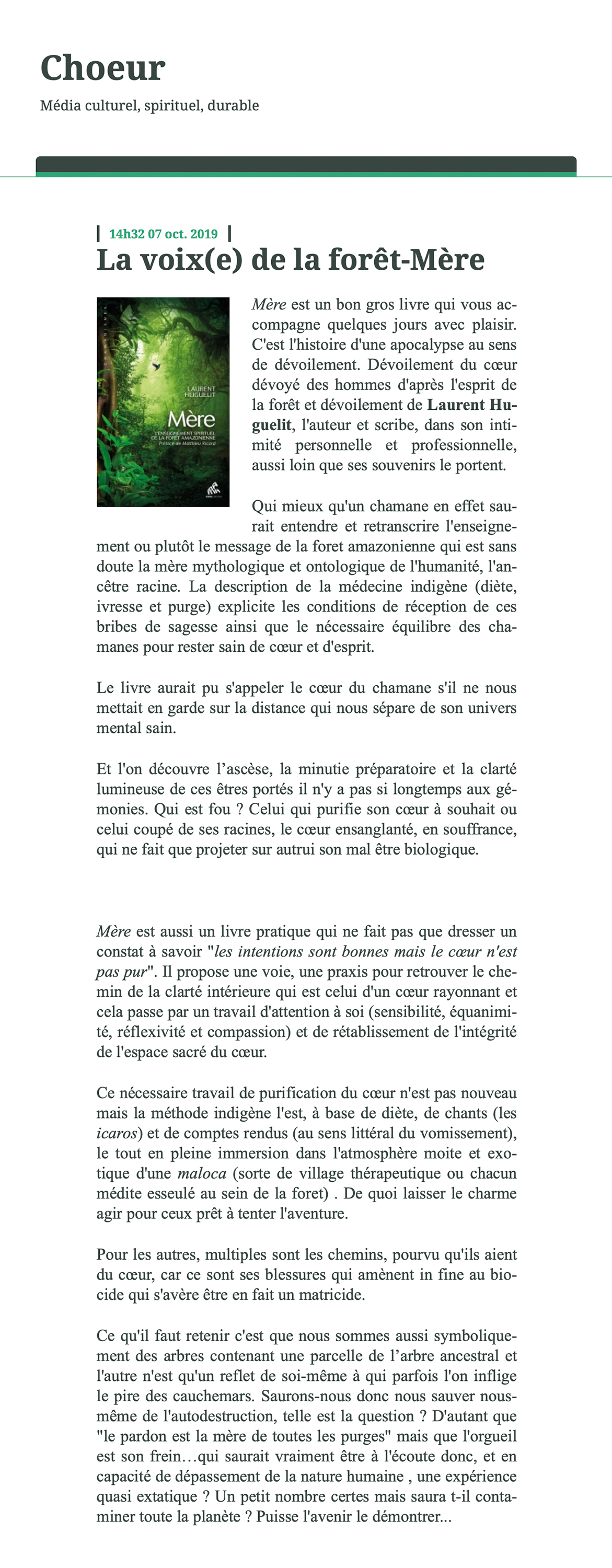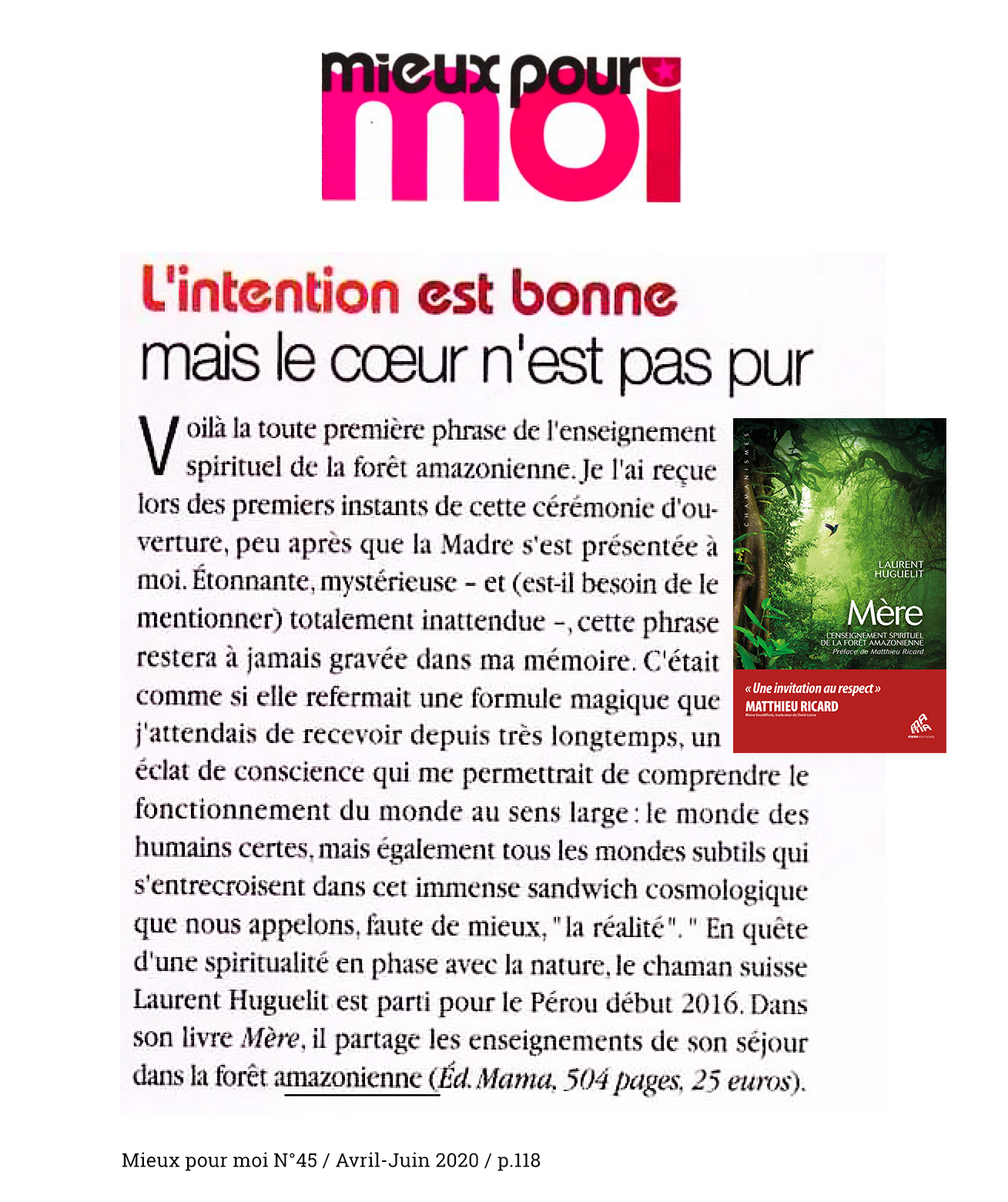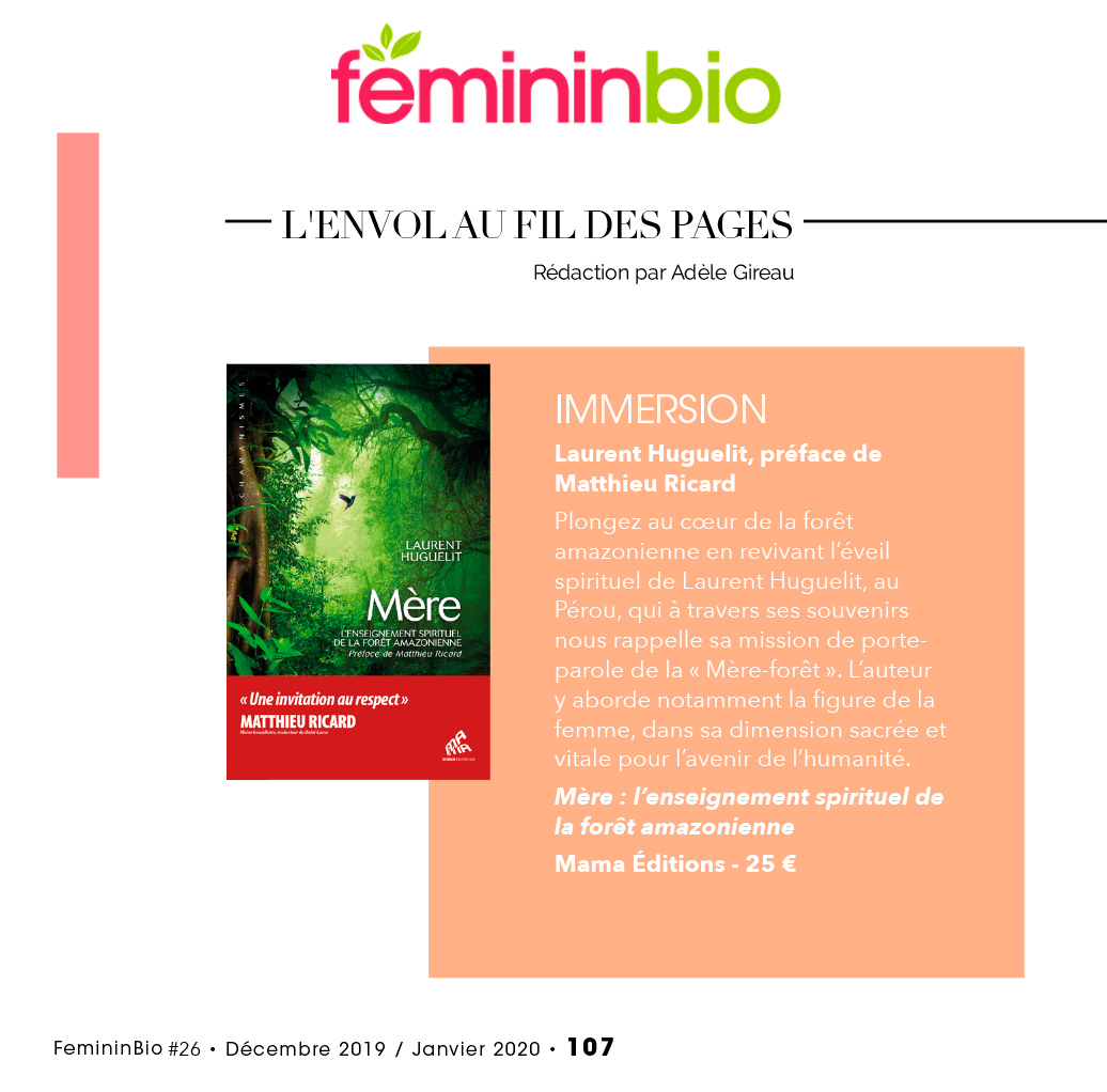 Dans cet ouvrage qui se lit comme un roman, Laurent Huguelit nous raconte cet épisode extraordinaire de sa vie et nous transmet l’enseignement spirituel de la forêt amazonienne. On est captivé de bout en bout.