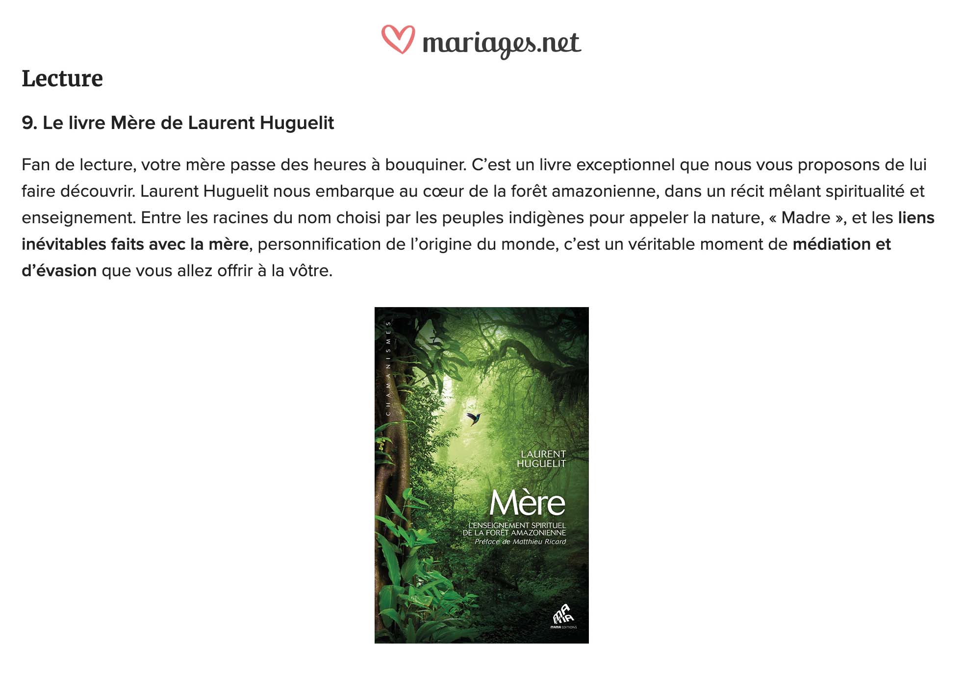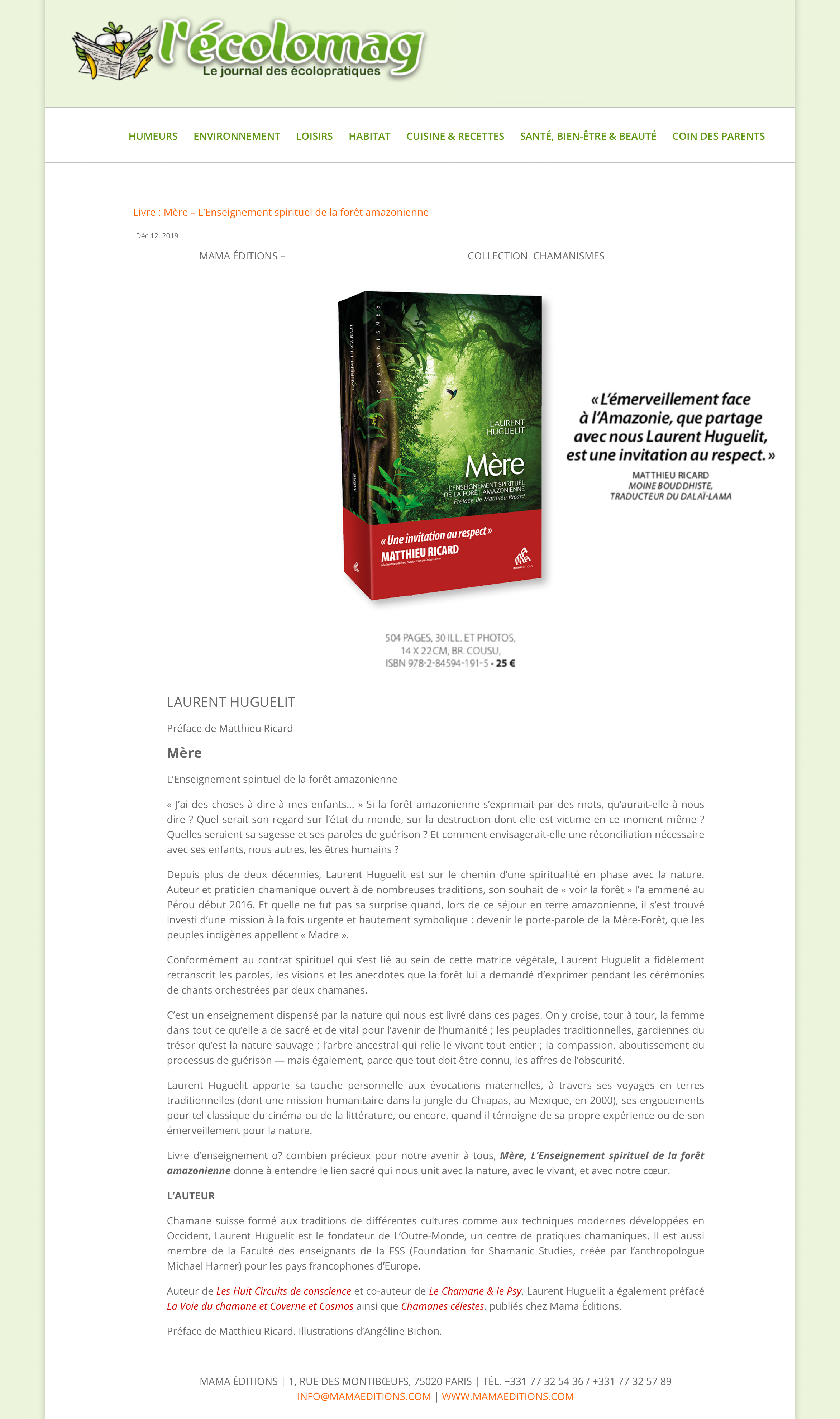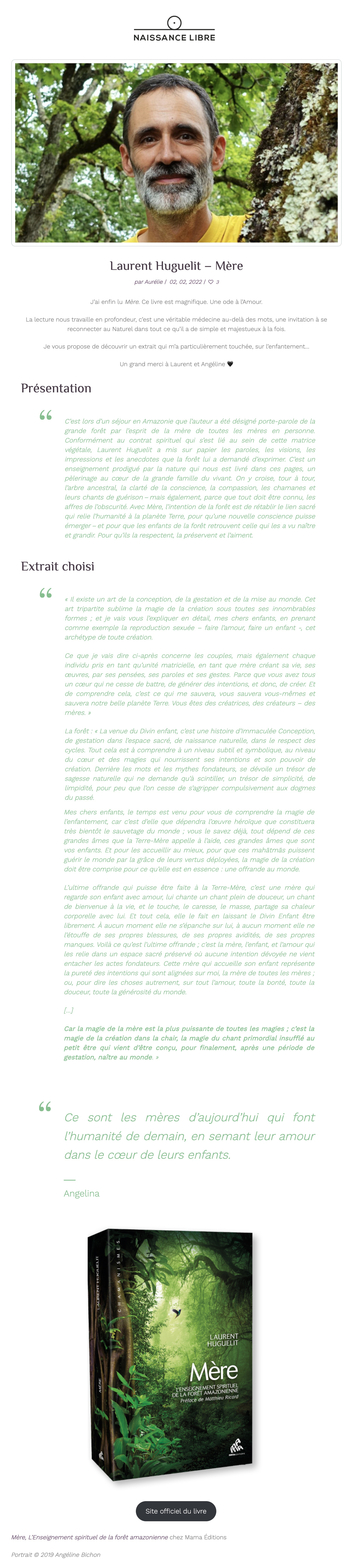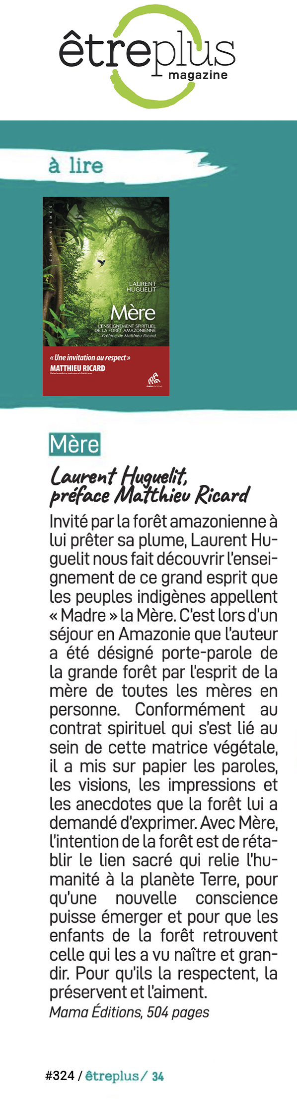 Dans cet ouvrage qui se lit comme un roman, Laurent Huguelit nous raconte cet épisode extraordinaire de sa vie et nous transmet l’enseignement spirituel de la forêt amazonienne. On est captivé de bout en bout.