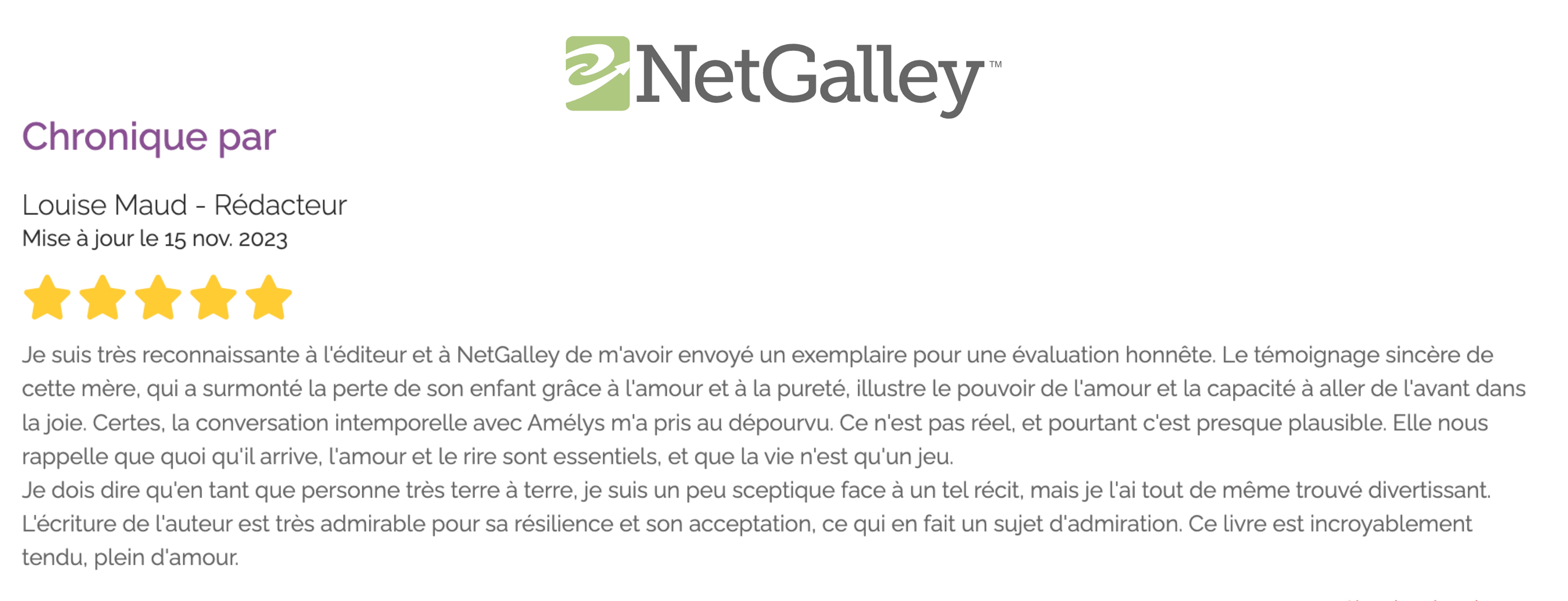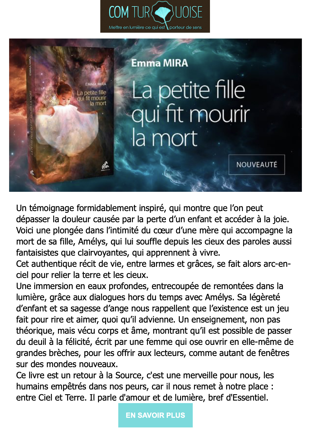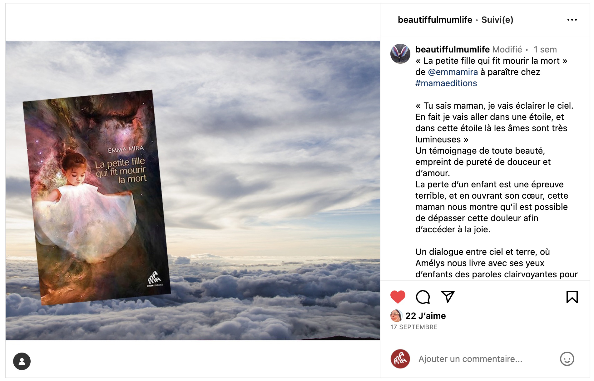 Un témoignage superbe d'une maman qui partage son intimité dans cette expérience de la douleur causée par la perte d'un enfant. Un récit vibrant hors du temps, qui vous emporte dans cette famille.
