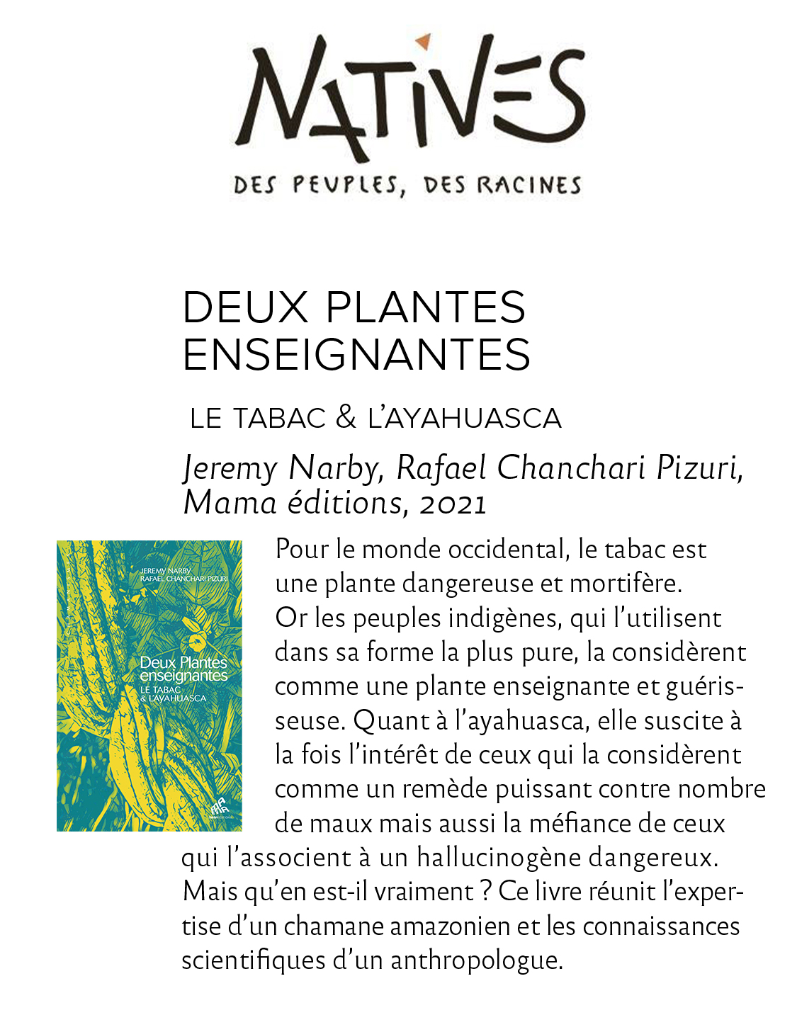 (Re)découverte de ce chamanisme fascinant, du monde des plantes enseignantes, de l'ayahuasca, mais aussi de l'importance capitale de la plante de tabac au cœur de ces pratiques. Pour une reconnexion au corps, mais également au monde environnant.