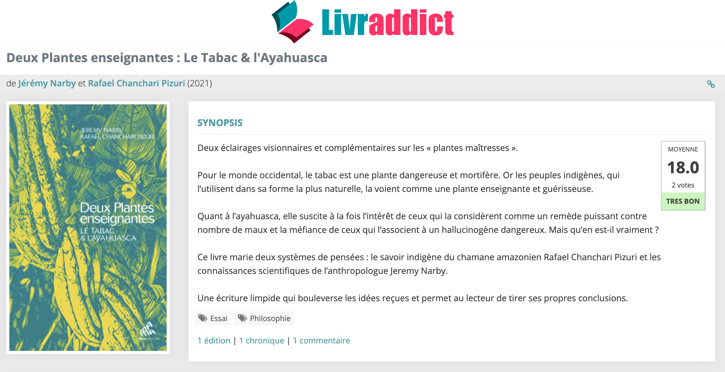 À l’opposé d’une joute oratoire entre la science et les perceptions d’un chamane Shawi, ce petit livre bourré de références amène le lecteur à un questionnement rafraîchissant (…).