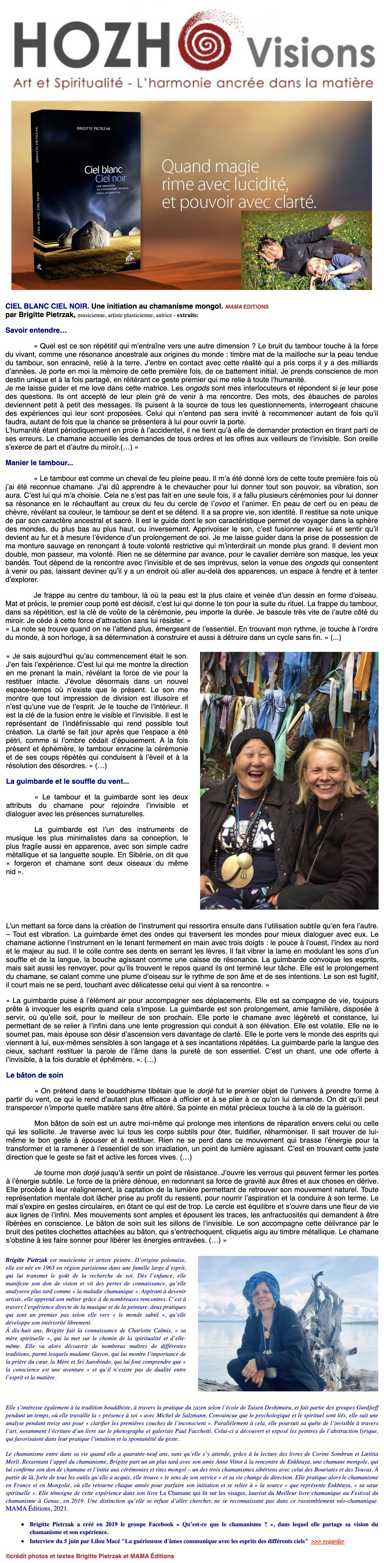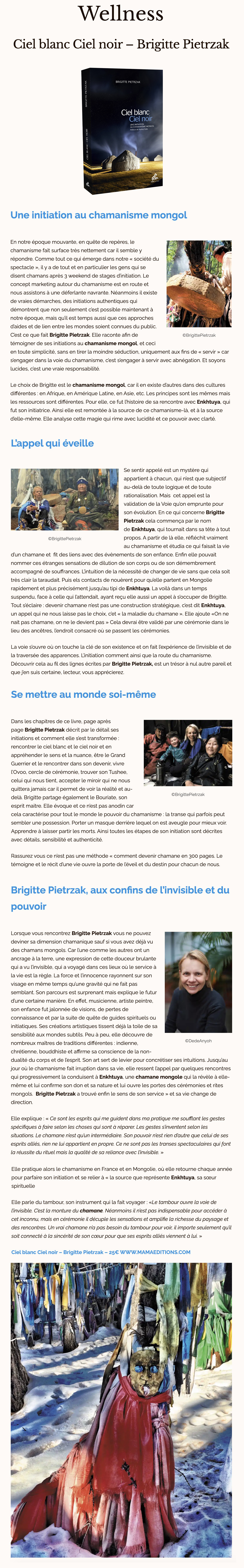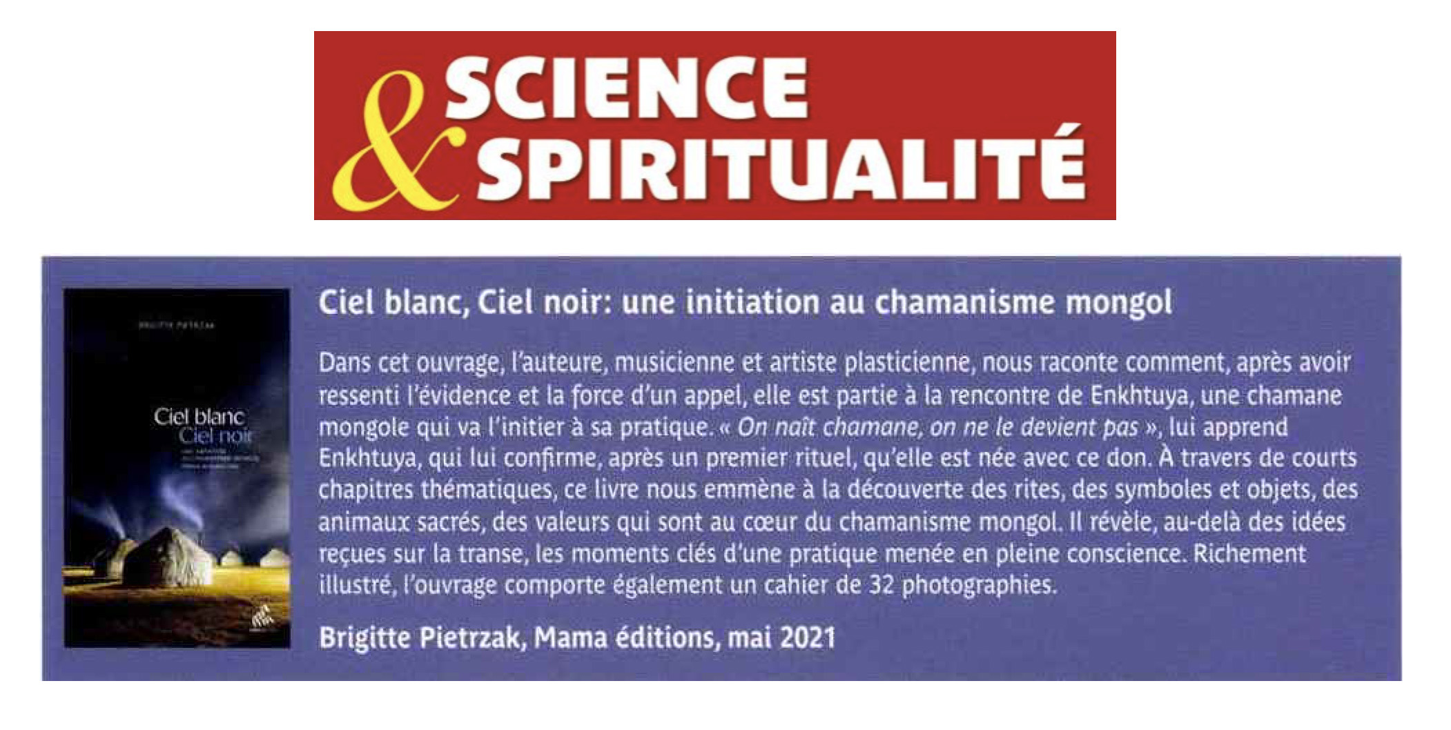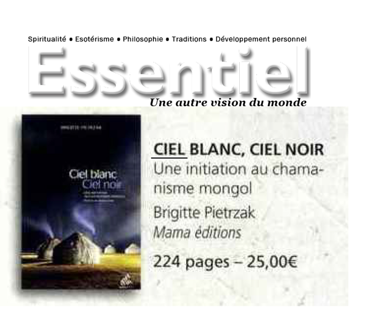 Dans [Ciel blanc, Ciel noir,] Brigitte Pietrzak raconte comment Enkhtuya, une chamane mongole, l'a initiée à sa pratique. Au-delà des idées reçues sur la transe, vous découvrirez les moments clés d'une pratique menée en pleine conscience.