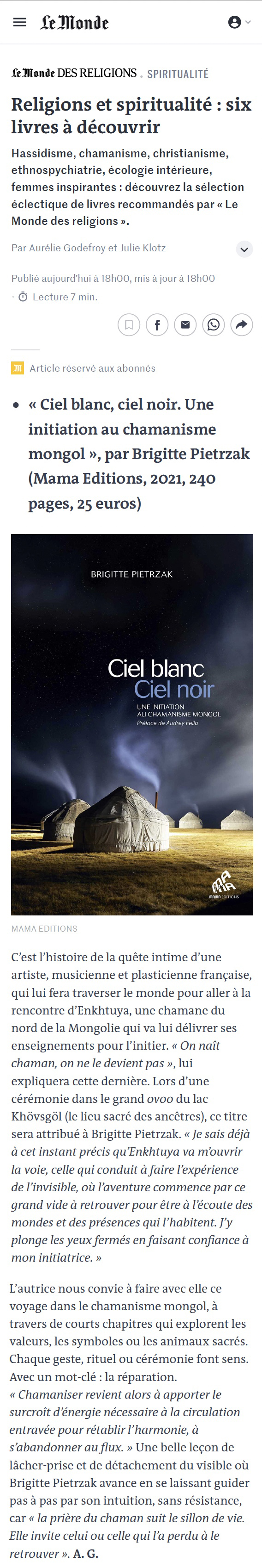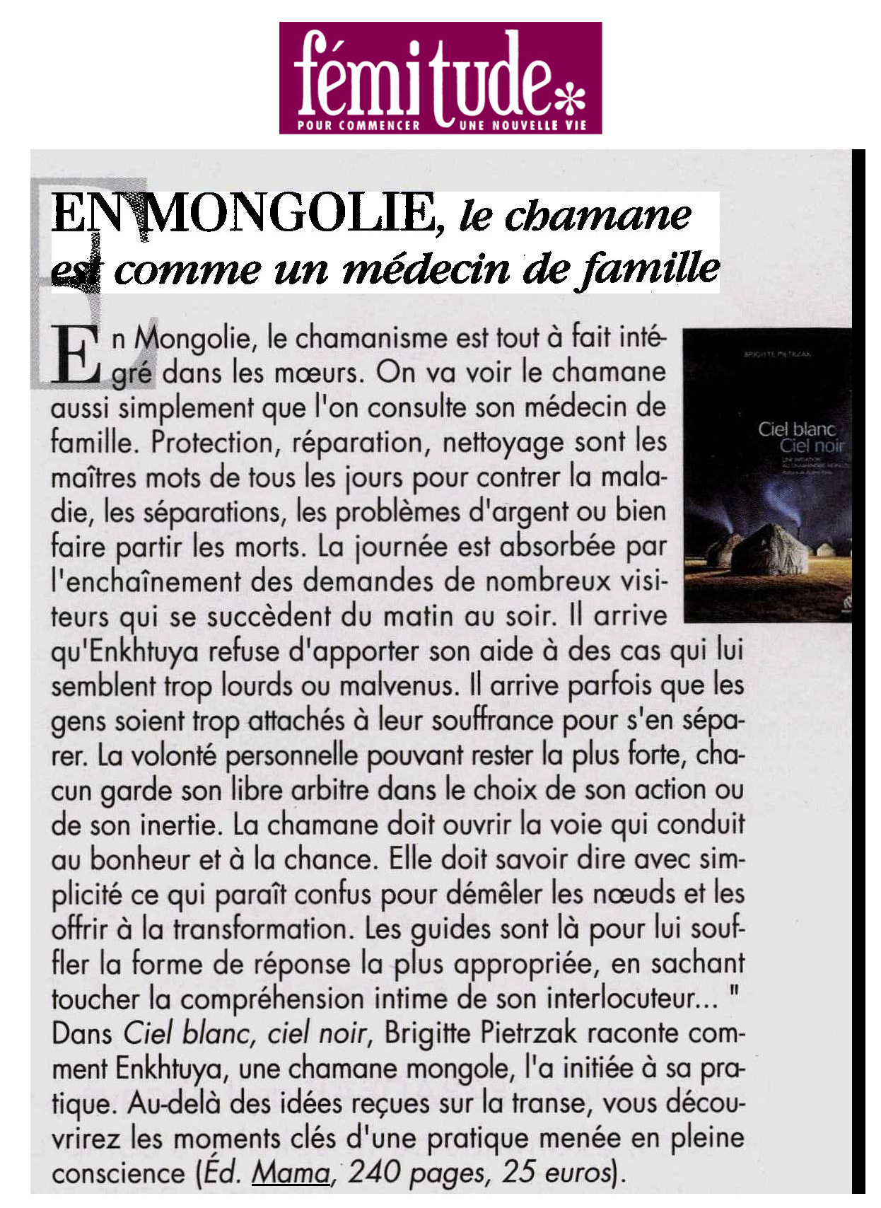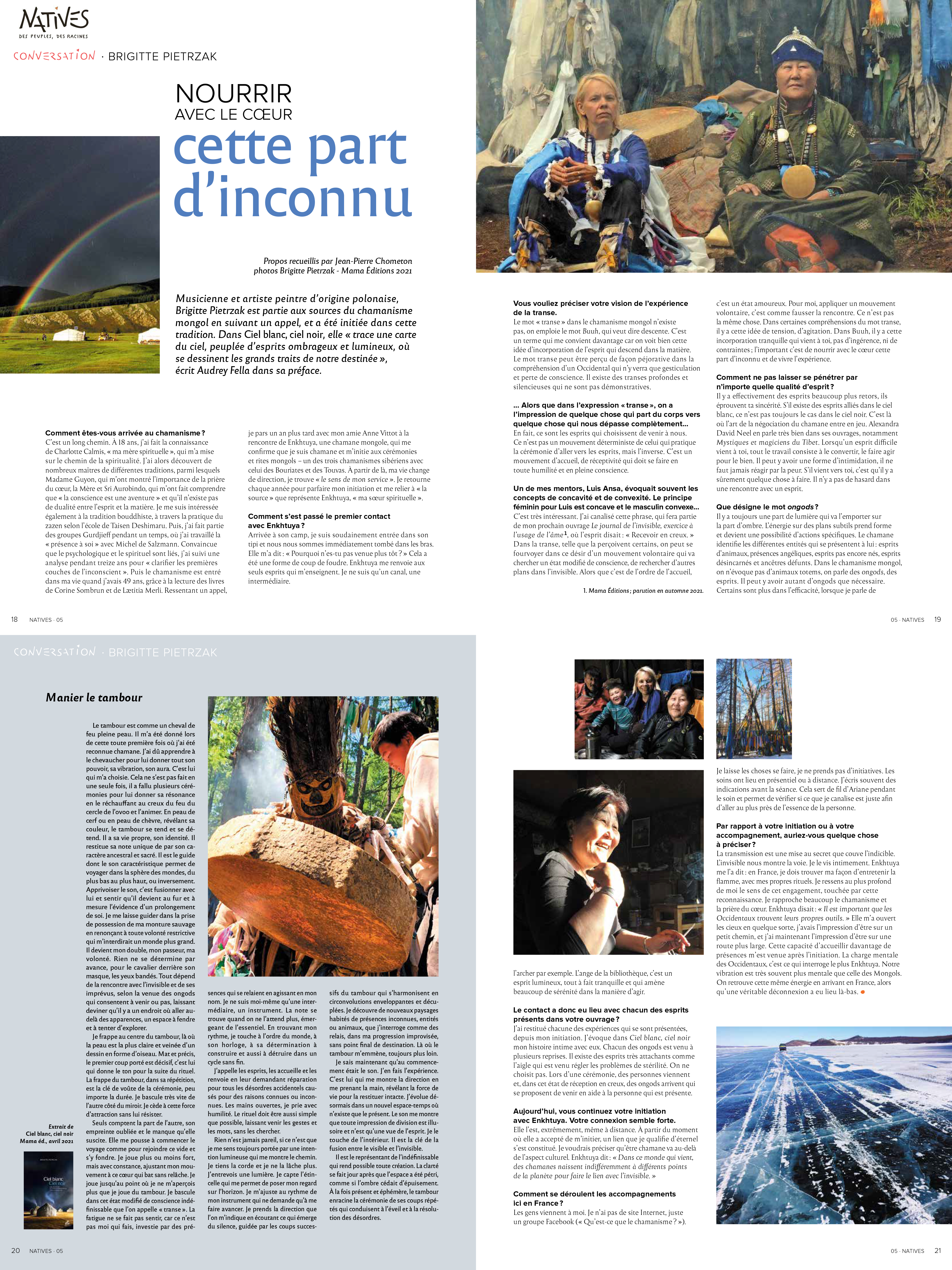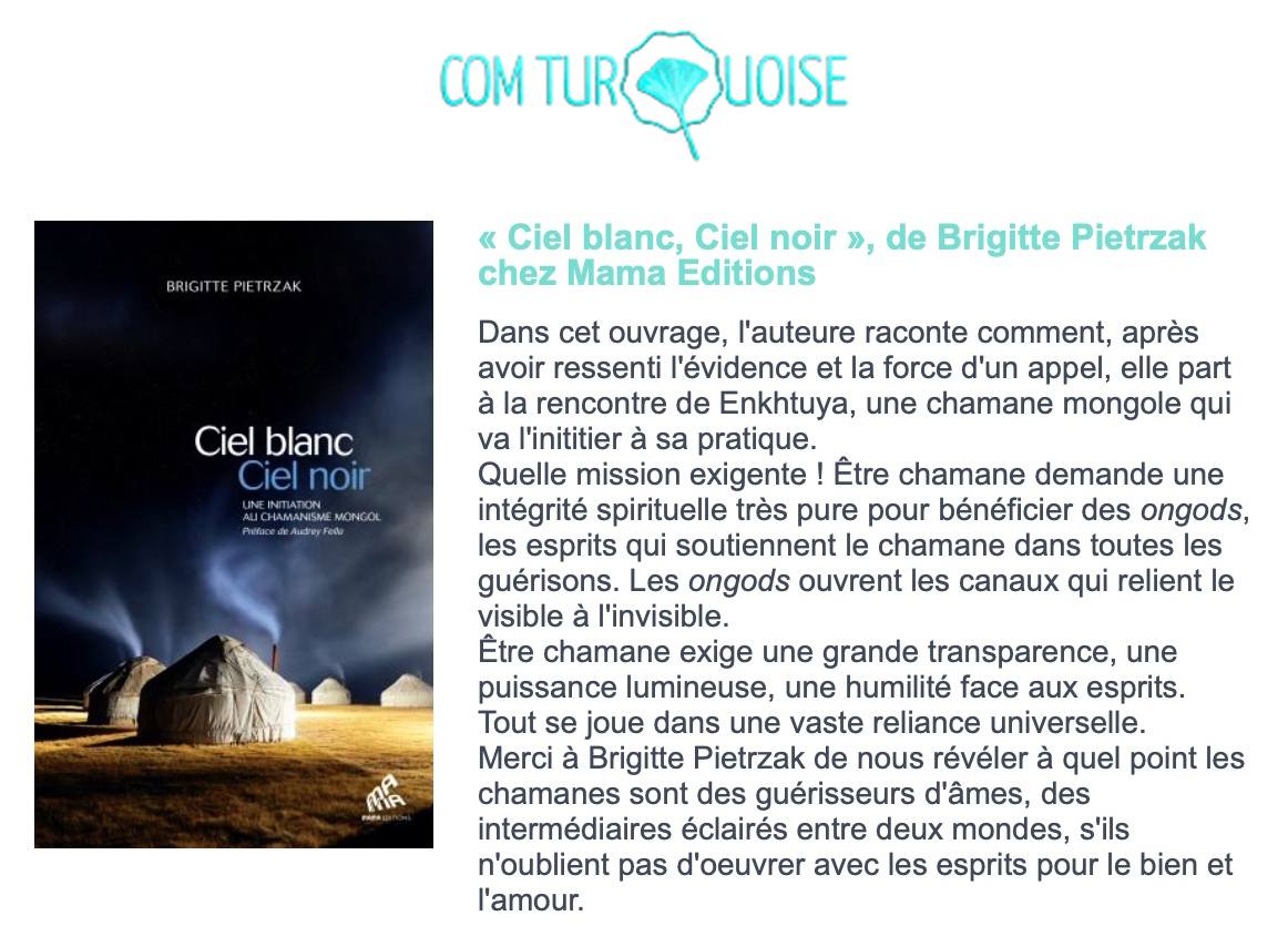 Dans [Ciel blanc, Ciel noir,] Brigitte Pietrzak raconte comment Enkhtuya, une chamane mongole, l'a initiée à sa pratique. Au-delà des idées reçues sur la transe, vous découvrirez les moments clés d'une pratique menée en pleine conscience.