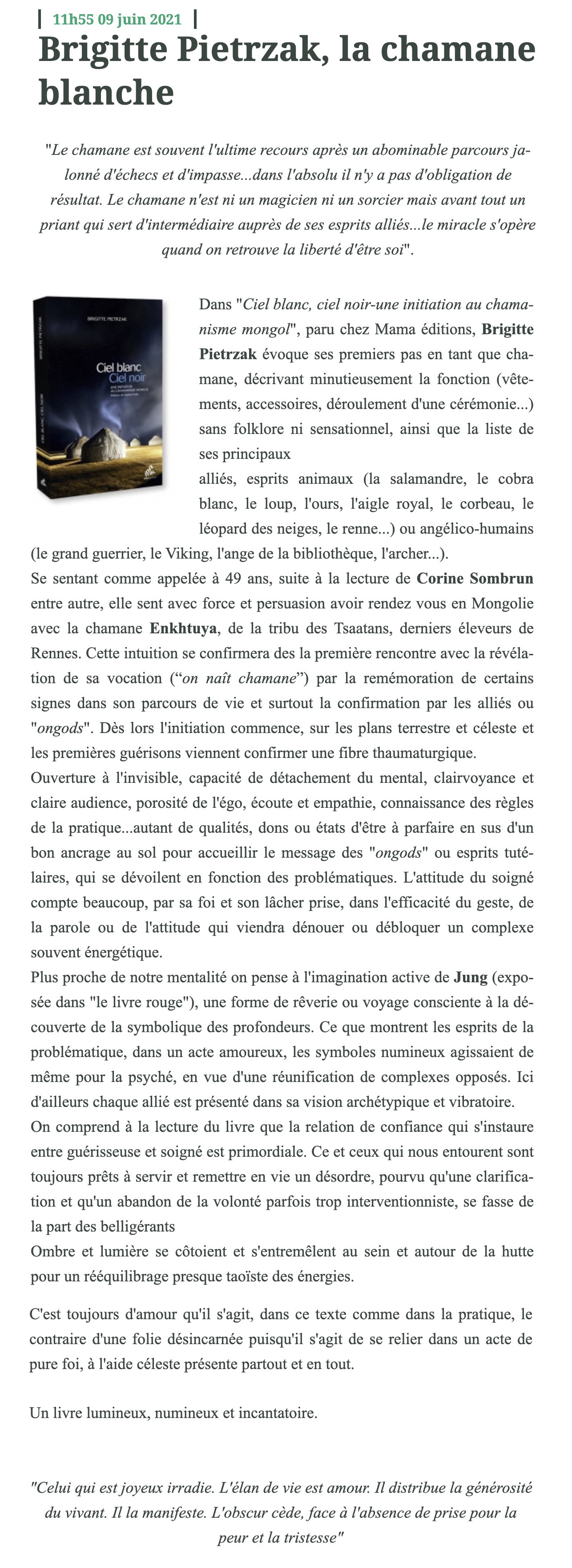 Merci à Brigitte Pietrzak de nous révéler à quel point les chamanes sont des guérisseurs d'âmes, des intermédiaires éclairés entre deux mondes, s'ils n'oublient pas d'oeuvrer avec les esprits pour le bien et l'amour.