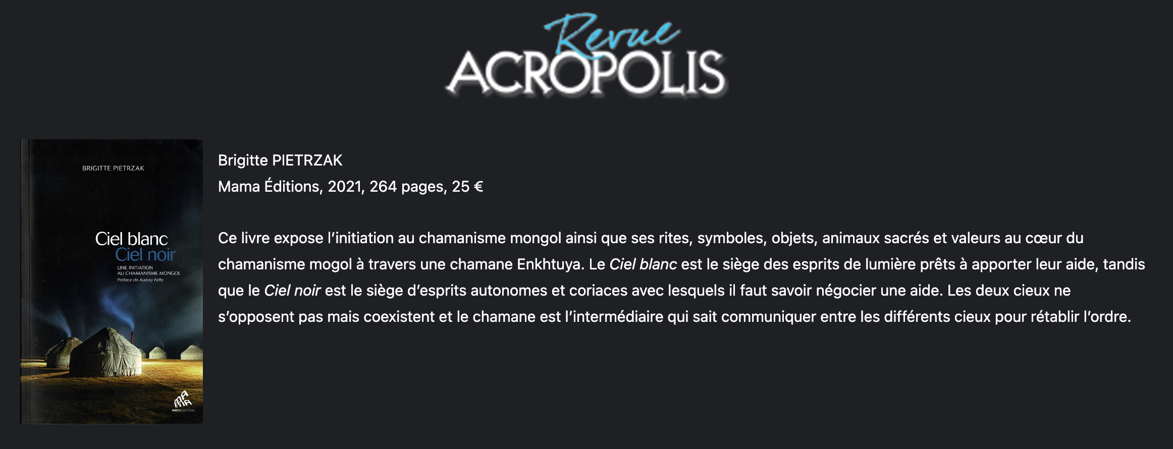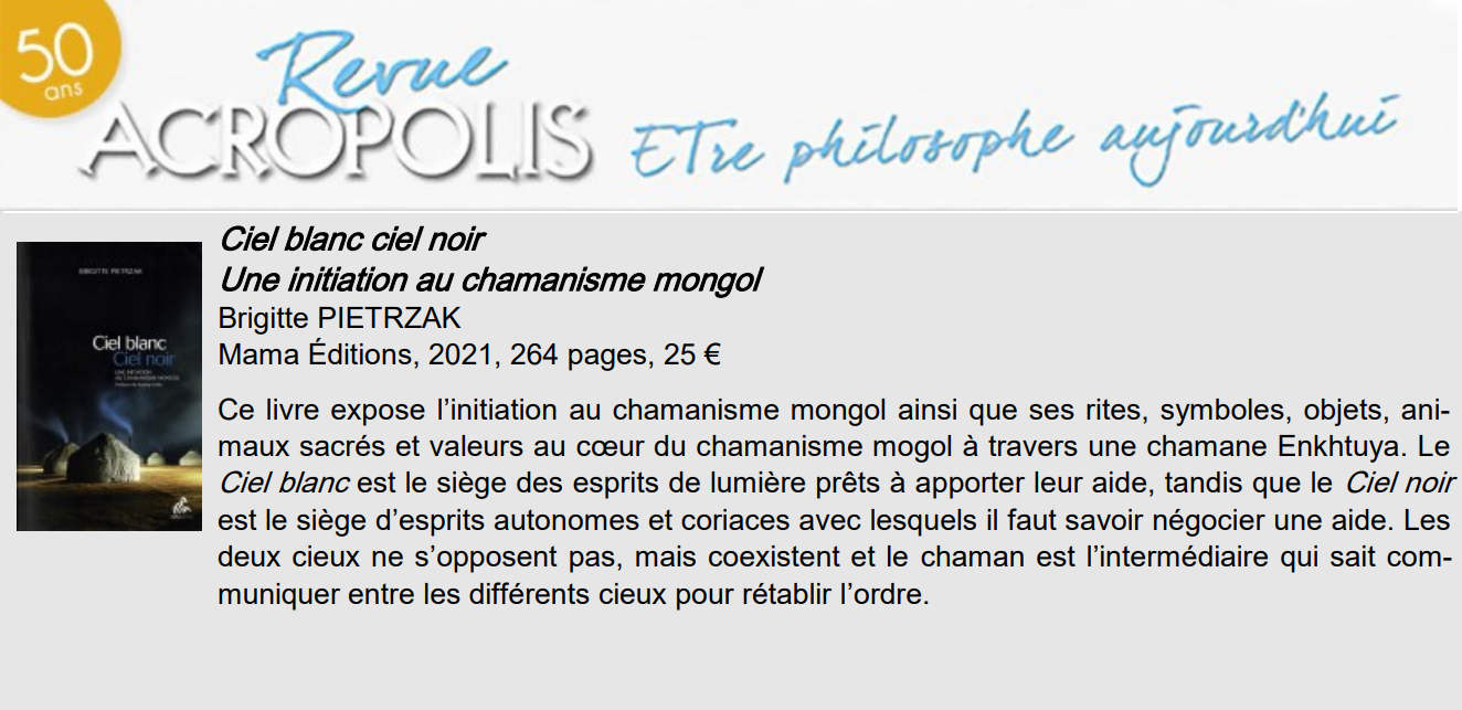 Un ouvrage très riche et authentique, bien loin des modes néo-chamaniques et ancré dans la tradition millénaire des chamans mongols, tout en étant ouvert au monde tel qu'il est aujourd'hui.