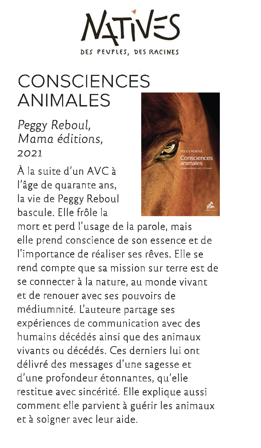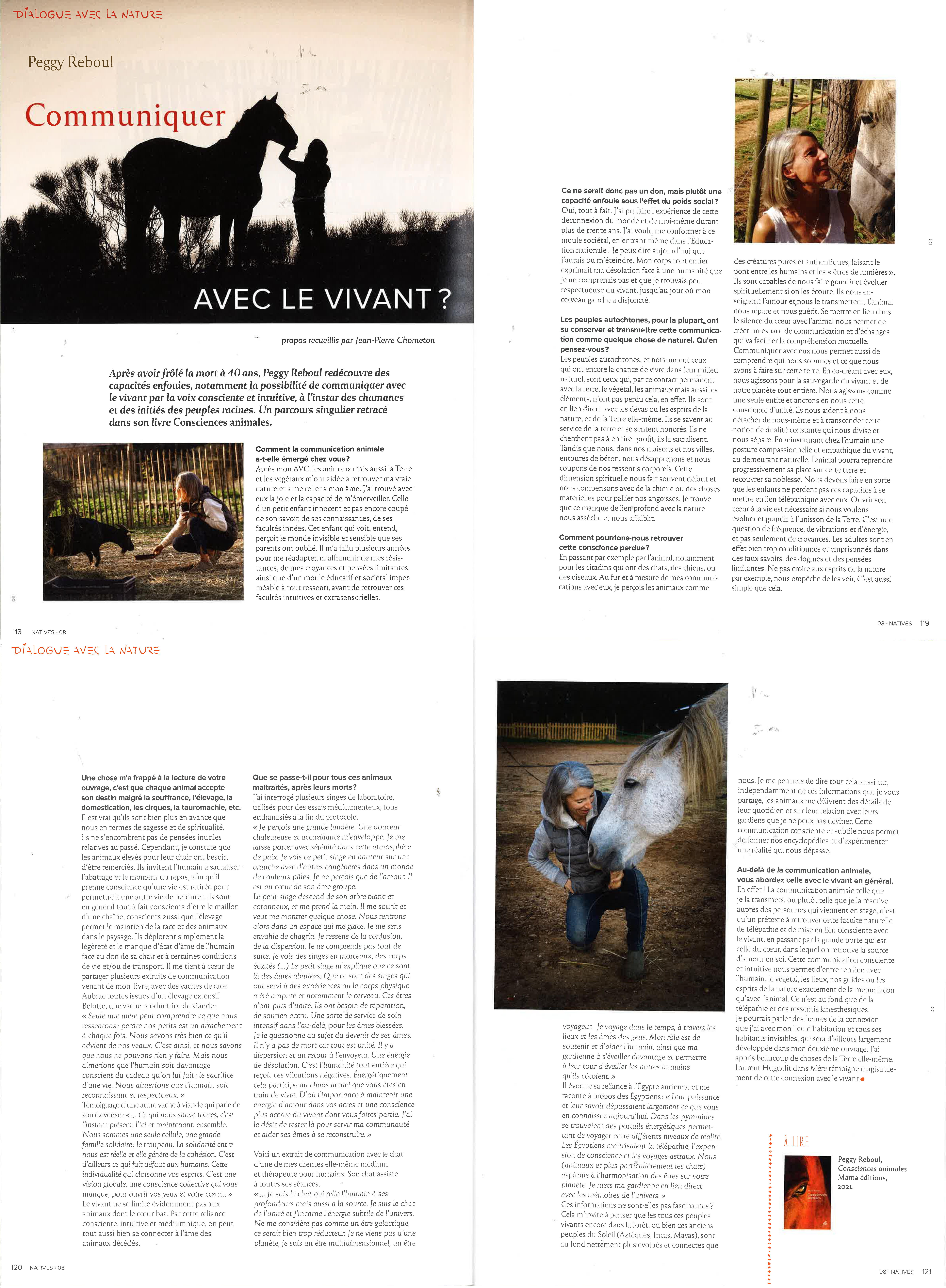 Après avoir frôlé la mort à 40 ans, Peggy Reboul redécouvre des capacités enfouies, notamment la possibilité de communiquer avec le vivant par la voix consciente et intuitive, à l’instar des chamanes et des initiés des peuples racines.