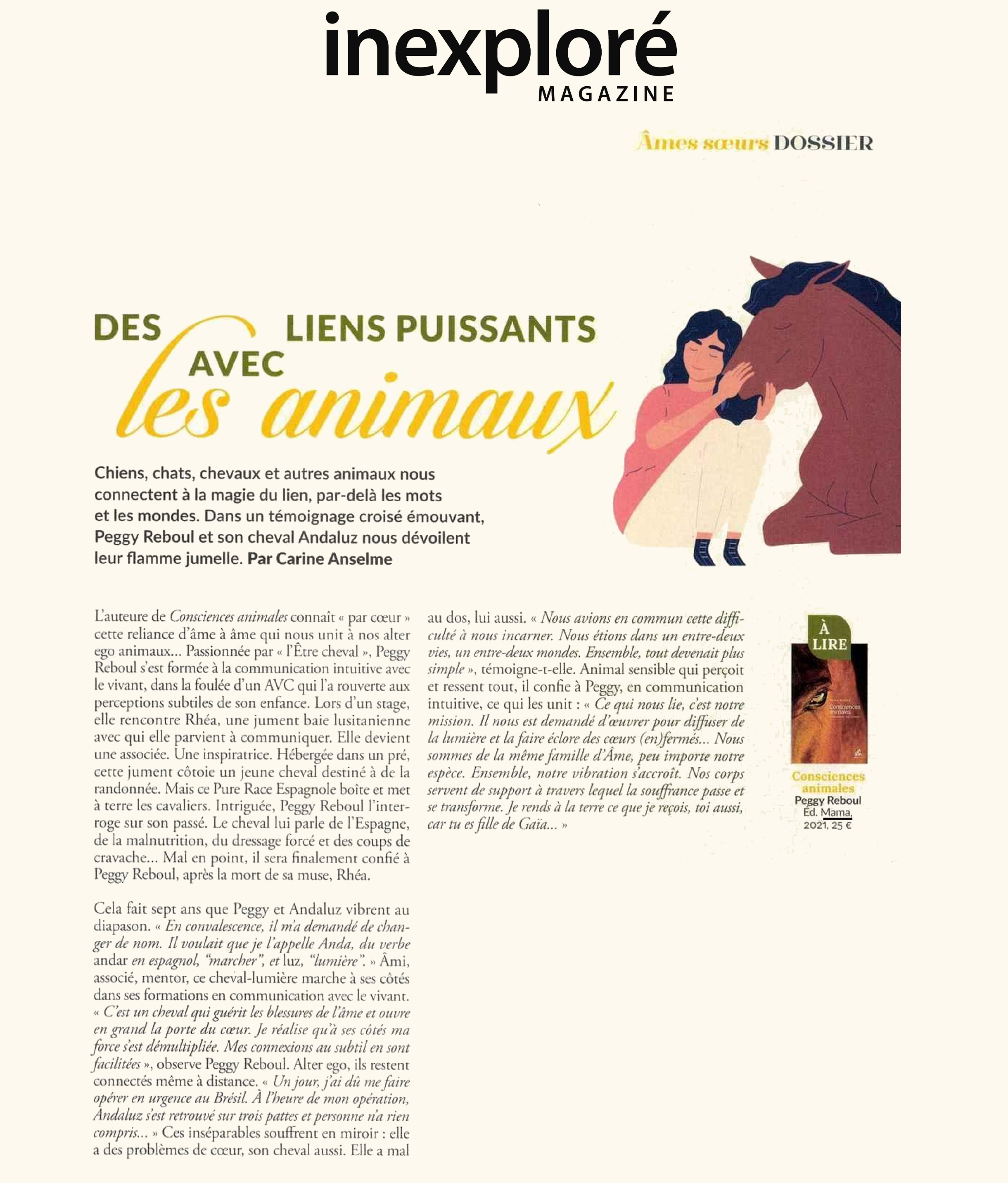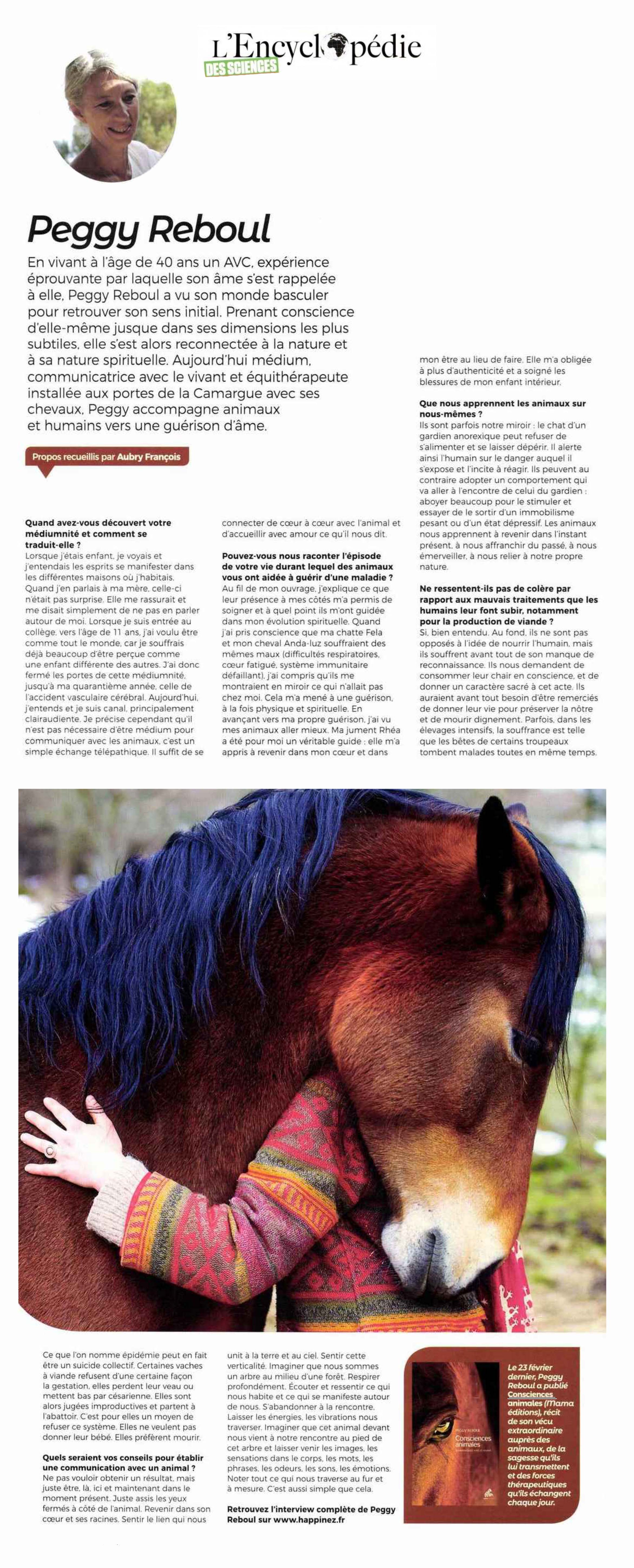Quand le maître devient l’élève, c’est la merveilleuse expérience que nous offre Peggy Reboul dans son travail de communication avec les consciences animales invitant à une révision profonde de nos croyances. C’est depuis une douzaine d’années qu’elle accompagne les animaux et leurs gardiens dans un dialogue d’âmes à âmes. En reconnectant l’humain à la nature, elle lui permet de se relier à sa propre nature.